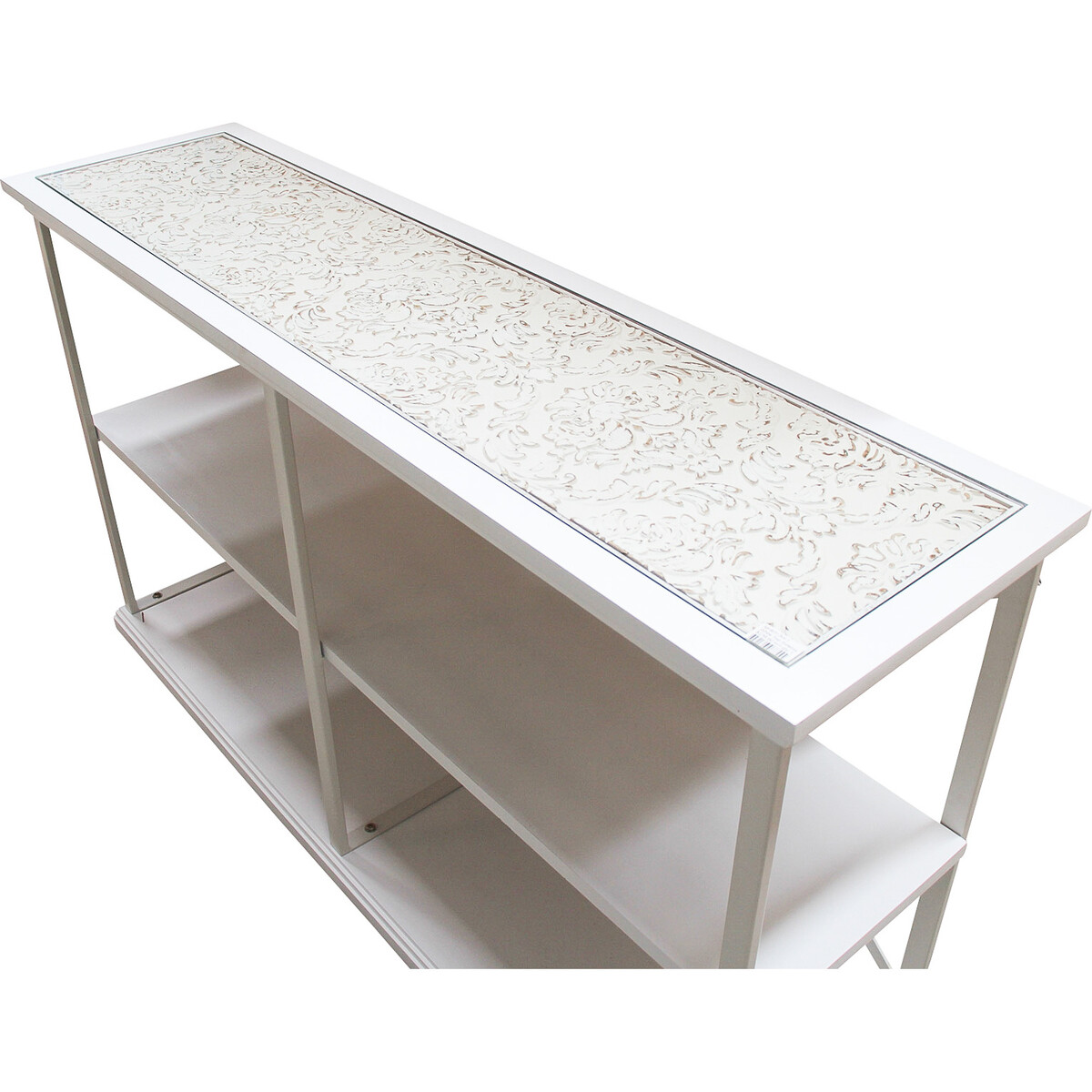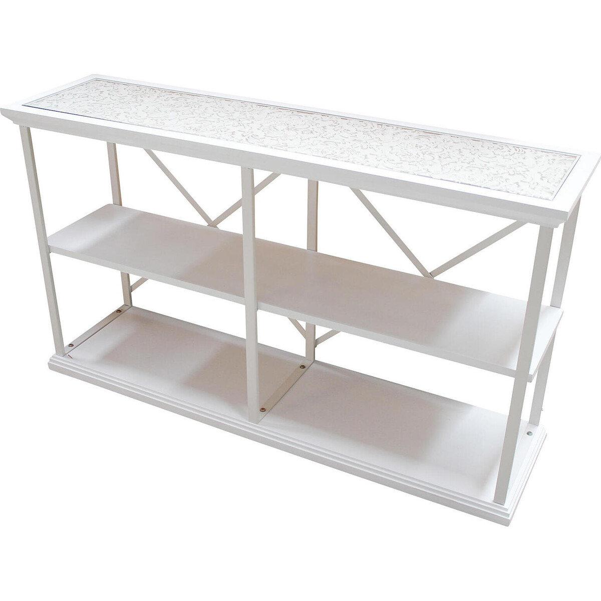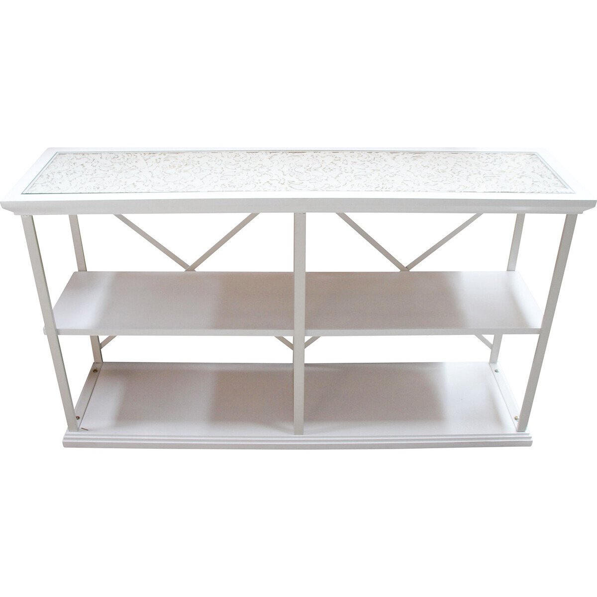 Made from sturdy timber, the top made of inlay work that has been washed in white, this sideboard with its neo classic appeal, will blend in well with all kinds of settings be it traditional or contemporary. Large shelf spaces promise adequate amount of display area for lamps, keeping of books, crockery and all that you choose to help make an attractive display. Supported by frame painted in white blending with the timber body of the sideboard, the fresh white colour makes any space liven up with the sparkle of its freshness. The shelves along the 152 cm long body are long and wide enough for displays, adding much ease to its utility. Place books, your choicest china or your collection of jars and containers, top it with a botanical print canvas and you would have nailed the look for you dining space. Sturdy, well balanced and proportioned to give you the best in shelf space and help add a touch of modern classic appeal.