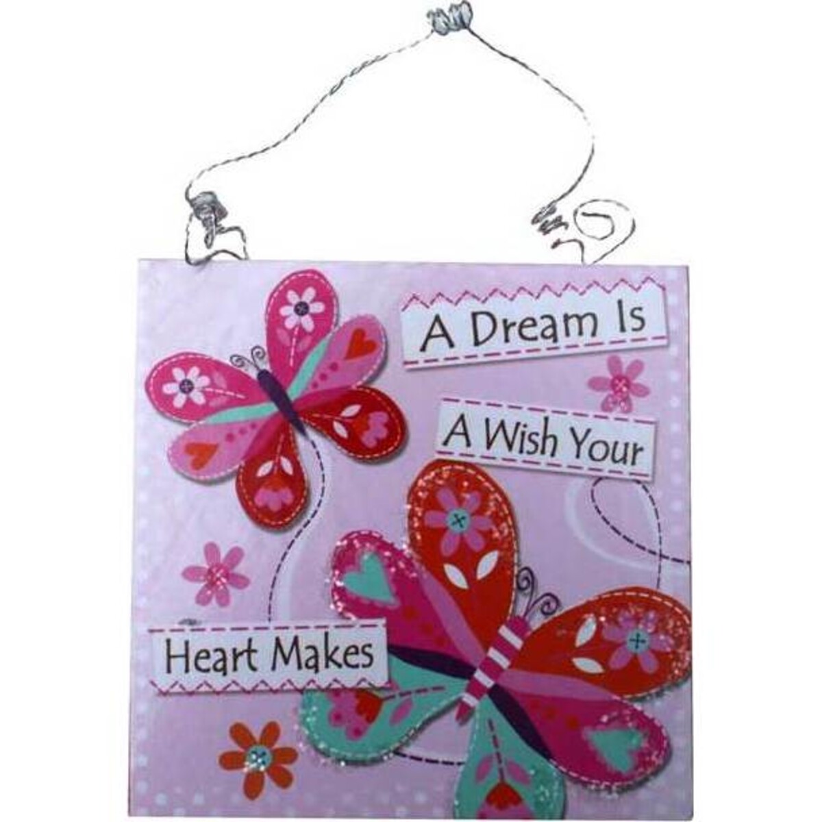 The 13 cm long and 13 cm wide sign made of wood is a lovely composition of picture, words and colours combining to create wonderful effect. The words printed in a lovely font is very country in its feel and also so very feminine in its appeal as it seems to be written on some kind of ribbon. 'Dreams are just wishes that our heart' - makes seems like a thought that helps one understand that we must take our dreams and our inner desires more seriously - a message that says that we must pursue what gives us happiness - a very positive thought that can be highly motivating for those who seem a little pessimistic about life. Two butterflies makes the sign all the more attractive as they have been beautifully embellished with designs of different kinds. The lovely pink background and the floral patterns all over make it very refreshingly different decor item to put up anywhere in one's home, particularly in the children's room. It comes with a twine attached to the top of the sign board which makes it easier to hang it where one may please.