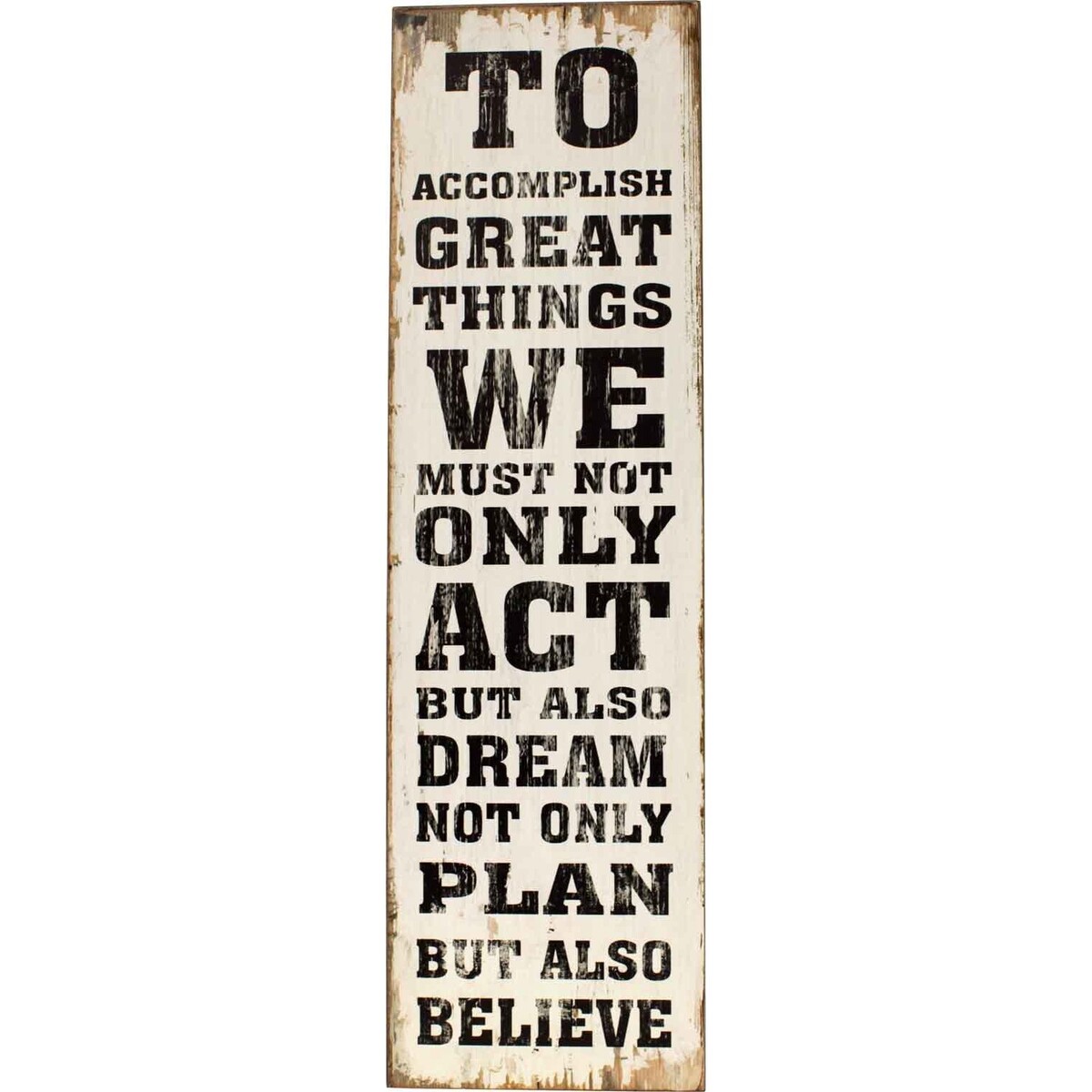 Sign Act Plan Believe is more than just an ordinary accessory. This signage offers inspiration and encouragement especially when hopes and moods are down. It is a perfect accent for any homes, offices and personal or business spaces. It is also a practical and unique gift item to boost someone's spirit and morale. The long, rectangular sign showcases bold and tangible prints for everyone to see. The beige coloured background is contrasted with the bold, black hued fonts. It has brown, worn out edges to showcase a vintage impact and concept. The big and eye catching texts read TO ACCOMPLISH GREAT THINGS WE MUST NOT OLY ACT BUT ALSO DREAM NOT ONLY PLAN BUT ALSO BELIEVE. The letters for these texts are in varied sizes but in bold black colours with faded effect.