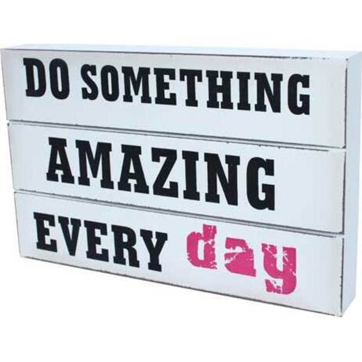 Consider this Amazing Sign the reminder you need every day to get out there and do something fantastic. This white sign states in bold black letters "Do Something Amazing Every" while "day" is written in pink. It's the perfect sign to hang up on the wall of your home, especially by your front door where you can see it as you're walking out the door. Whether you volunteer, pamper yourself with your favourite treat, read to your kids, or jump out of a plane, don't forget to do something incredible every day.