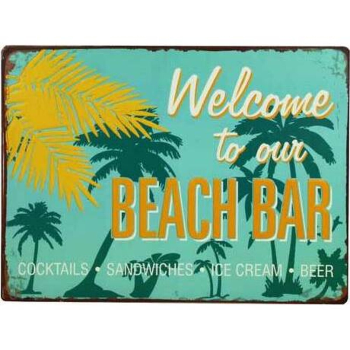 These metal signs feature an aqua background with teal and goldenrod coloured trees and wording that reads, "Welcome to Our Beach Bar; Cocktails Ice Cream Sandwiches Beer." The edges of the signs are worn to give them the illusion that they've been hanging outside of a beach bar for years. They're bright and vibrant signs that will certainly add a touch of colour to your décor whether you use them indoors or out. When you can't go to the beach, at least you can bring it to you!