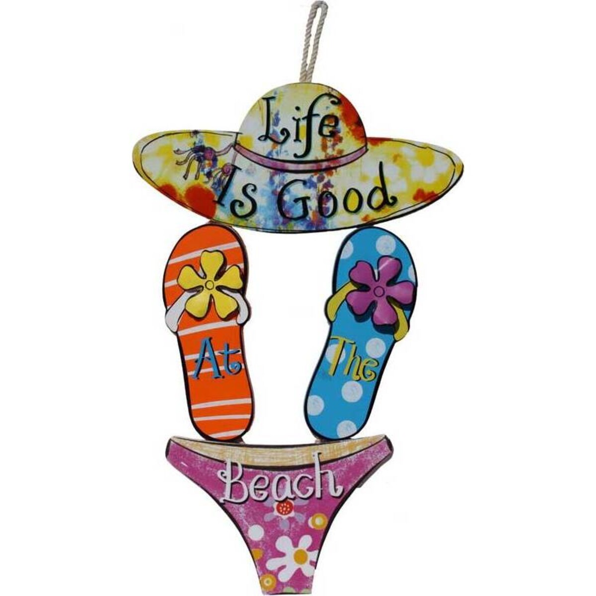 This decorative accent features a tie-dye coloured hat at the top, purple floral bikini bottoms below, and two colourful flip flops in between. The sign reads, "Life is good at the beach" in a variety of coloured letters. At the top is a small loop to allow for easy hanging. Whether you display this up at your beach house or you hang it in your home to remind you that a beach trip is not far off, you'll love incorporating it into your décor.