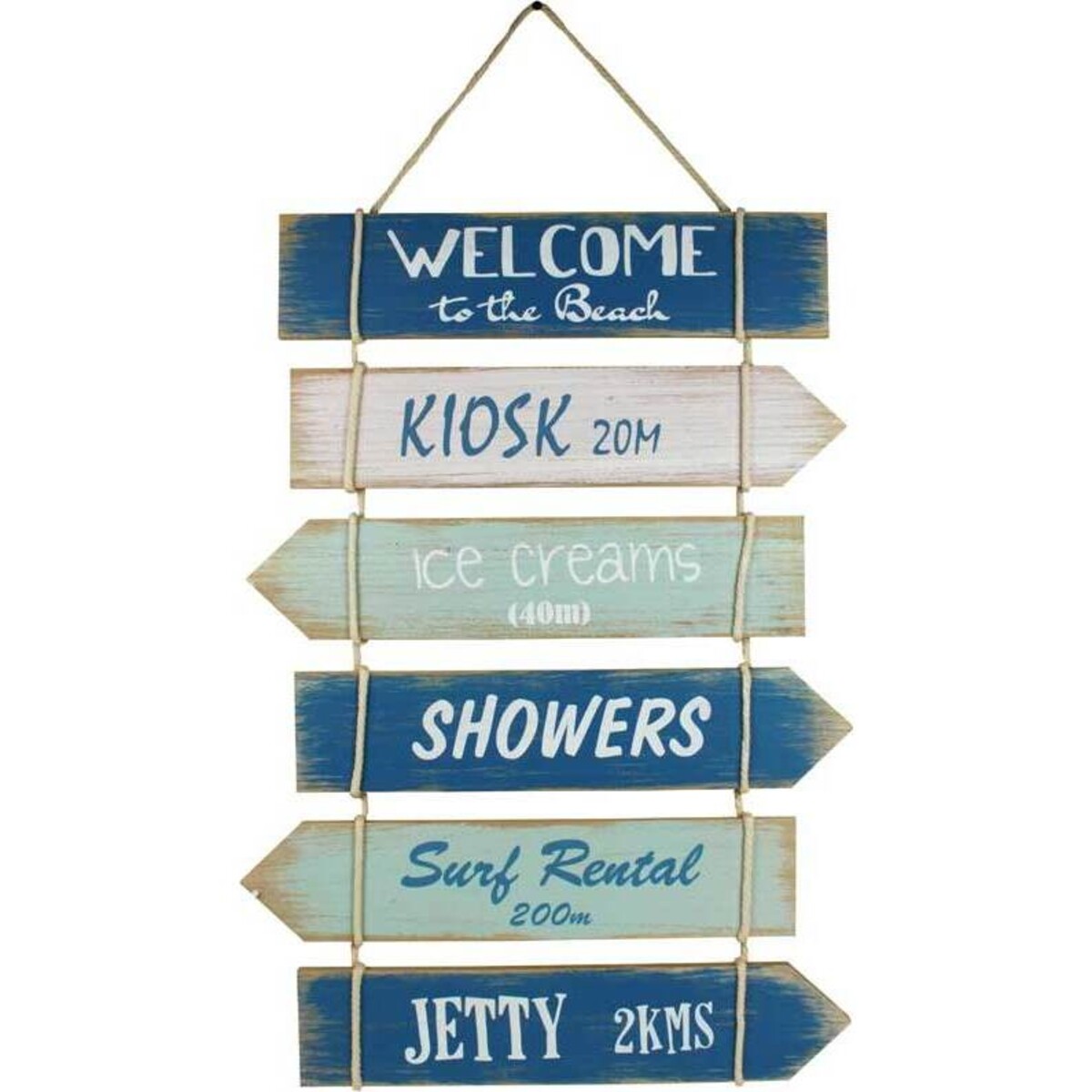 When you think of the seaside what comes to mind? Hot summer days, sipping a cool drink or eating an ice cream, or perhaps you enjoy water sports and surfing. Whether spending the day at the beach with family, friends or by oneself as a tourist, there are certain things we all associate with being by the sea. This sign, with its proportions of 70 x 50 cm and constructed from wood and rope, features beach-themed activities on arrows painted in varying shades of blue. The great thing about this sign is that it creates associations with the ideas of visiting the beach that we have in our minds. Whether your customers want it for a theme party, a restaurant, or any other purpose, it will liven up the vibe and subtly create an ambient mood that will have you instantly reminiscing on that summer holiday feeling.