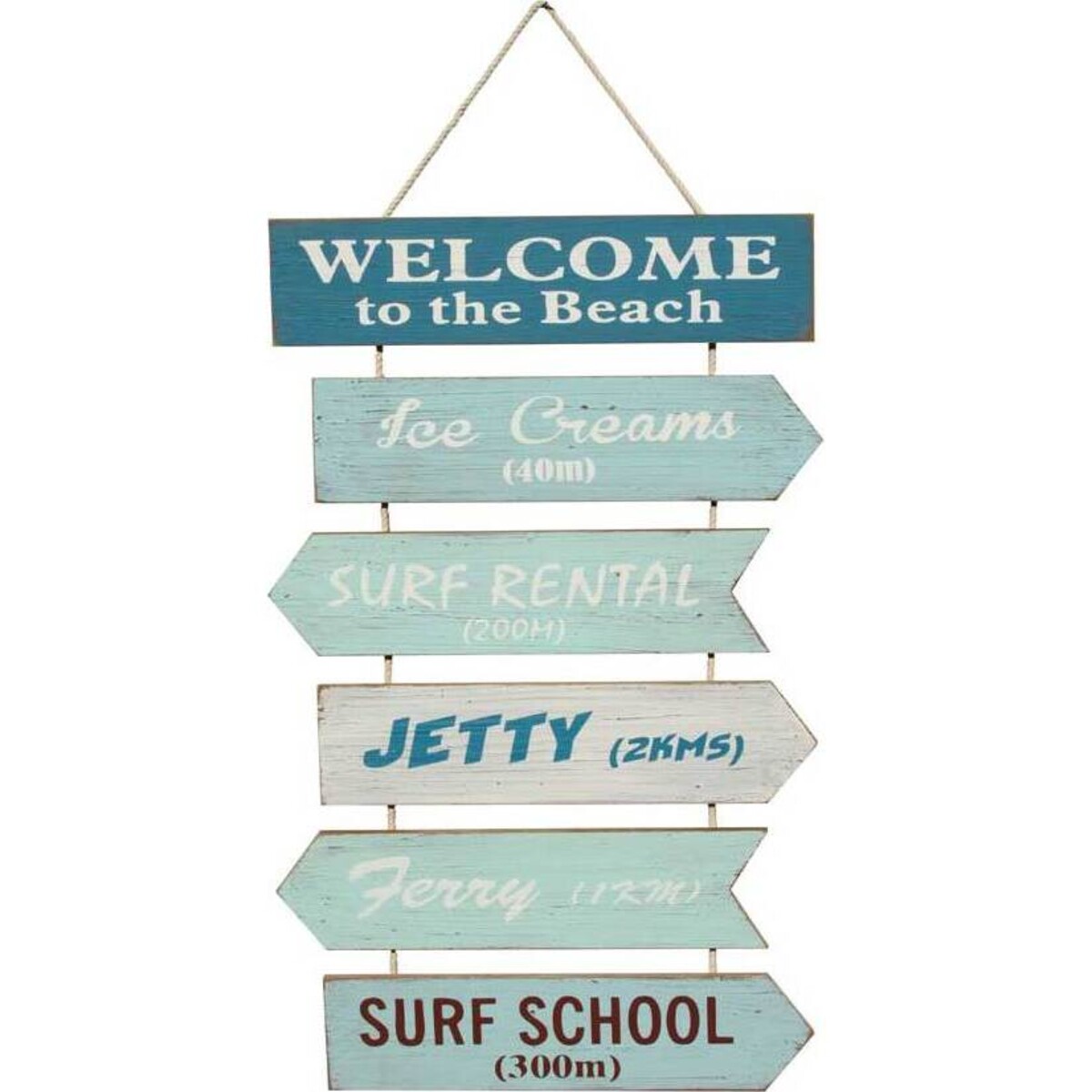 Bring the seaside holiday feeling to any space with this with this pleasantly coloured sign that features arrows displaying various beachside activities. Painted in shades of muted blues and greens, it gives off the impression that you are only minutes away from the time of your life. Ideal for whatever you may want to use it for - whether for a public space like a cafe or an occasion like a party - this sign will bring the light and breezy seaside theme to life and create its own unique and festive ambience. It has been crafted from high-quality, sturdy wood and measures at an impressive 80x 60cm. It is popular both as gifting item and as a personal purchase, due to its combination of durability and pleasant appearance é a wise purchase that leaves every customer satisfied.