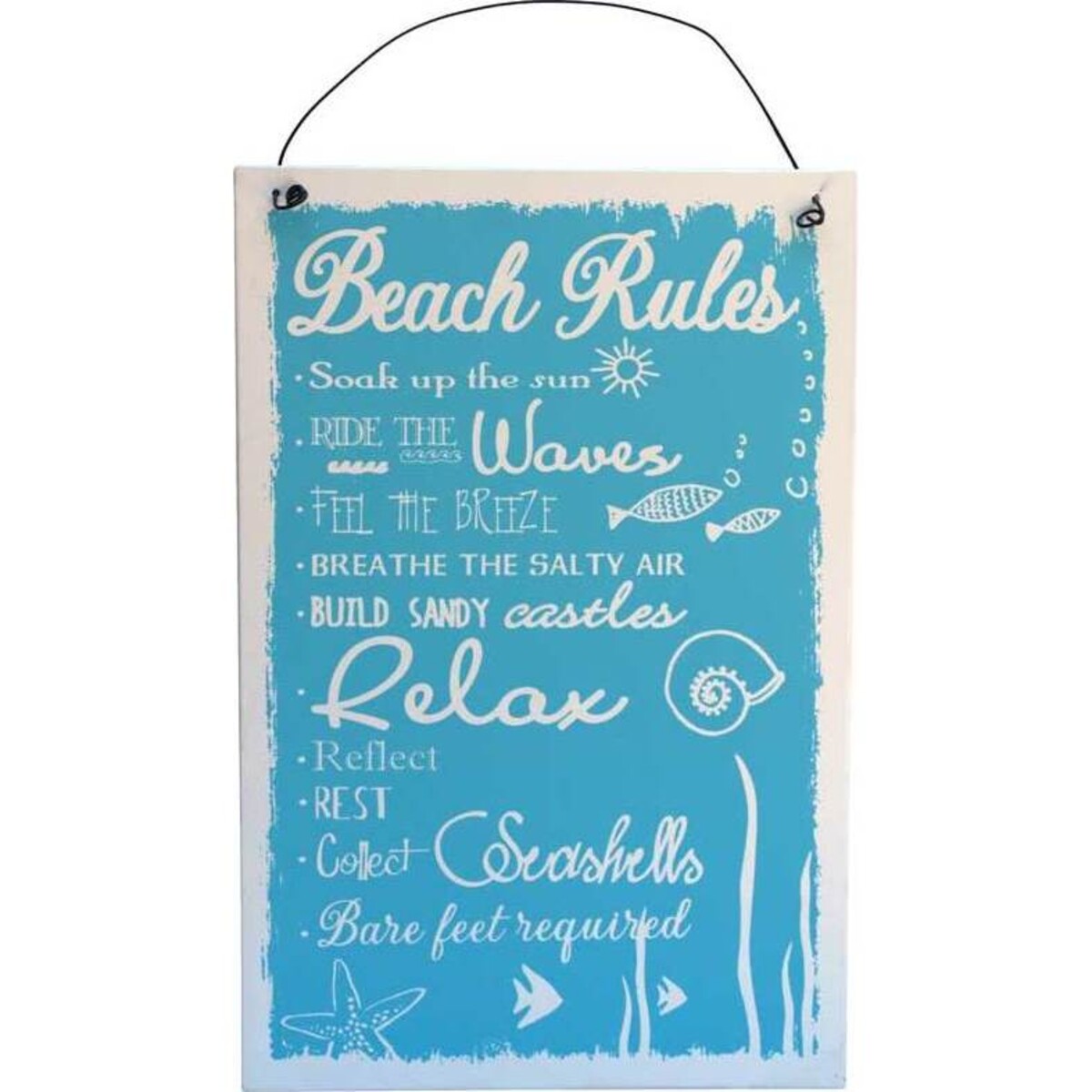 While we may collect a lot of knick knacks to make any space come alive with the seaside theme, a few statement pieces do make a far bigger impact just like this hanging sign from Lavida on Beach Rules. About 32 cm tall and 21 cm in width, it will take up a moderate amount of space on the wall and make a huge impression with not just its graphics but also its cheerful relaxing message - which simply asks one to have a good time at the beach by doing certain things, which include actions like - soak in the sun, ride the waves, feel the breeze, relax, reflect and rest and collect seashells and many such suggestion that sounds truly a happy relaxing restfulness. The tin sign bears the look of a vintage signboard that has rubbed paint along the edges. Its fun and holiday mood is something one would love to see each day of the year irrespective of the season.