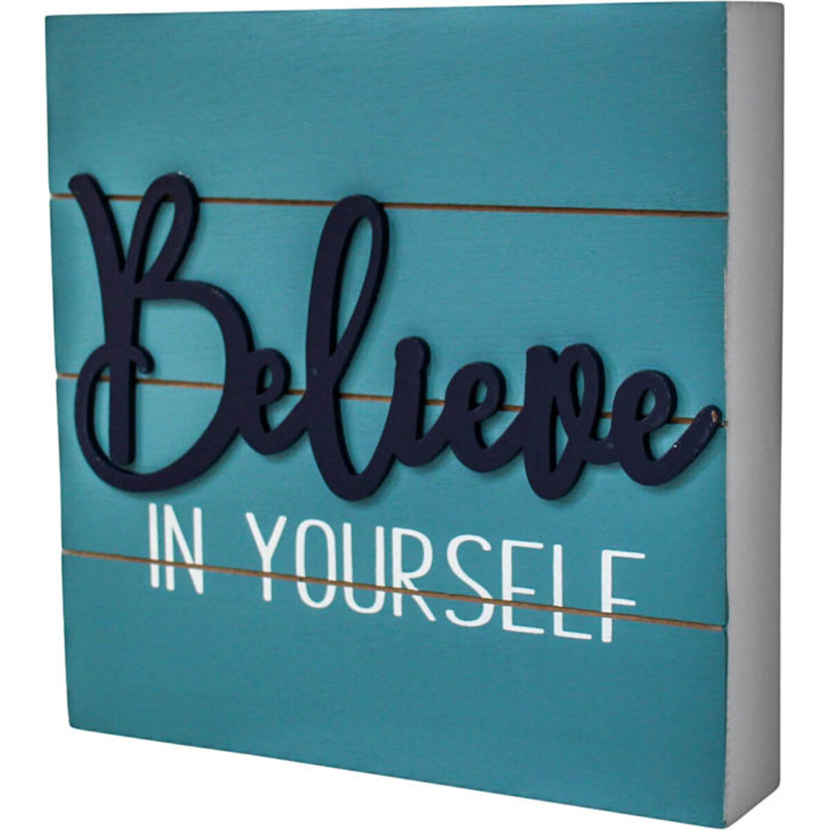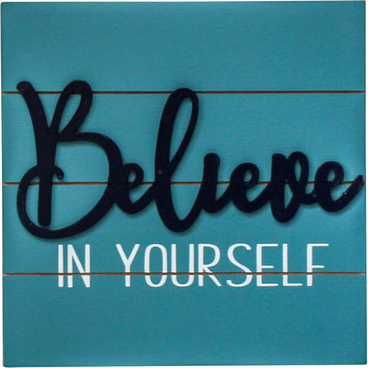 This Sign Believe was crafted for two principal purposes; to provide your self-doubting customers with the needed motivation in order to achieve their endeavours and also to provide a colourful decorative ambiance. "Believe IN YOURSELF" is the motivational message written on this wooden sign. Customers who place this chic sign in their bedroom or any other place where they can see it every day would be able to boost their self-confidence against any challenge waiting for them in the day. As a chic décor piece, the wooden frame is hued in steel blue background over which words are written in stylish fonts.