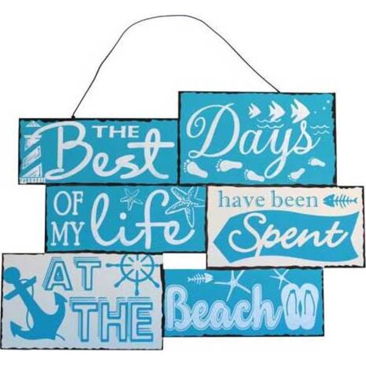 Brightening up any space is this collage of six tin plates almost glued together in its similar submission of their love for the sea as the words put together reads - The Best Days of My Life Have been Spent at the Beach. This sign would look gorgeous on your bedroom wall, the outdoors, at a beach shack or pub and places where the sound of the waves breaking confirms the reason for such love. The blue and white colours and the wording with its typical images and symbols like palm trees, anchor, star fish, footprints on sand and flip flops all lend the sign board a rather attractive look - more like a art canvas. In fact each of the six boards seem to have a different font from the other adding another dimension to the detail yet they all are bound cohesively to one love.