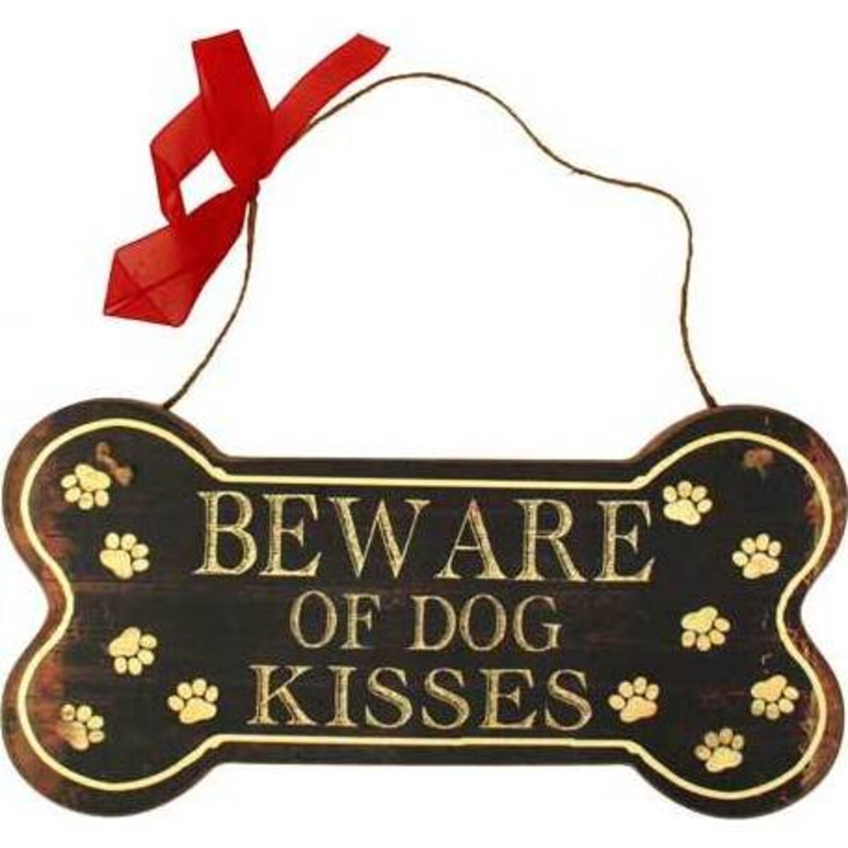 These horizontal signs are in the shape of dog bones and feature a dark brown background, a cream - coloured border with matching paw prints, and wording that reads, "Beware of Dog Kisses." A string is attached at the top to allow for easy hanging, and the finishing touch is a vibrant red bow. They're the perfect signs to put in a pet shop, an animal shelter, or even in your own home. They also make wonderful gifts for the dog fans in your life.