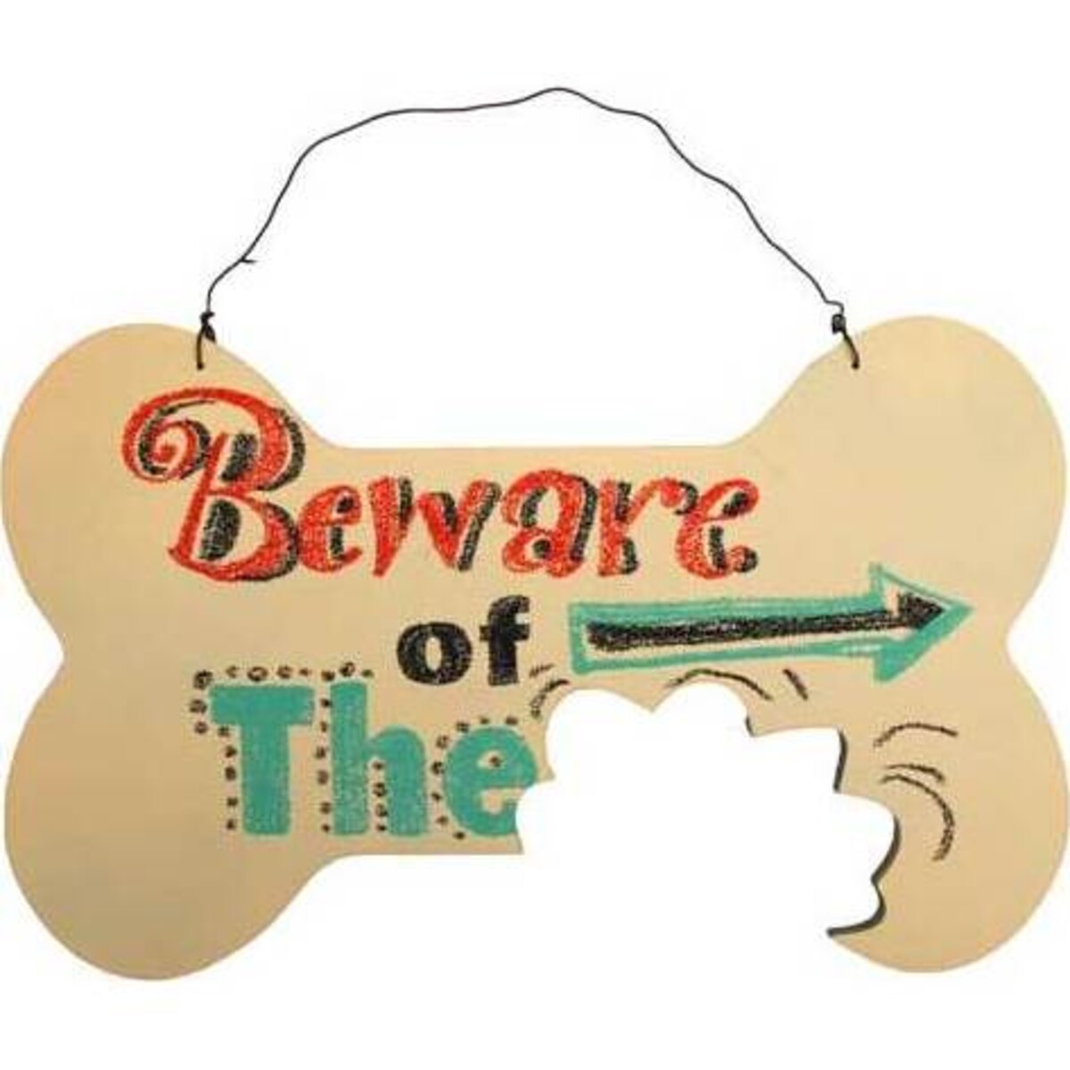 This sign leaves ample room for your creativity while at the same time giving you all that was hard to produce. It has the words "Beware of the" and an arrow pointing to the right side of the sign. There is also a space after the word "the" which can be used to fit just about anything. However, the original reason for the space is to show the presence of a dangerous dog that took a bite and left off with part of the sign. The sign is shaped like a bone hence it passes the message in a funny way.