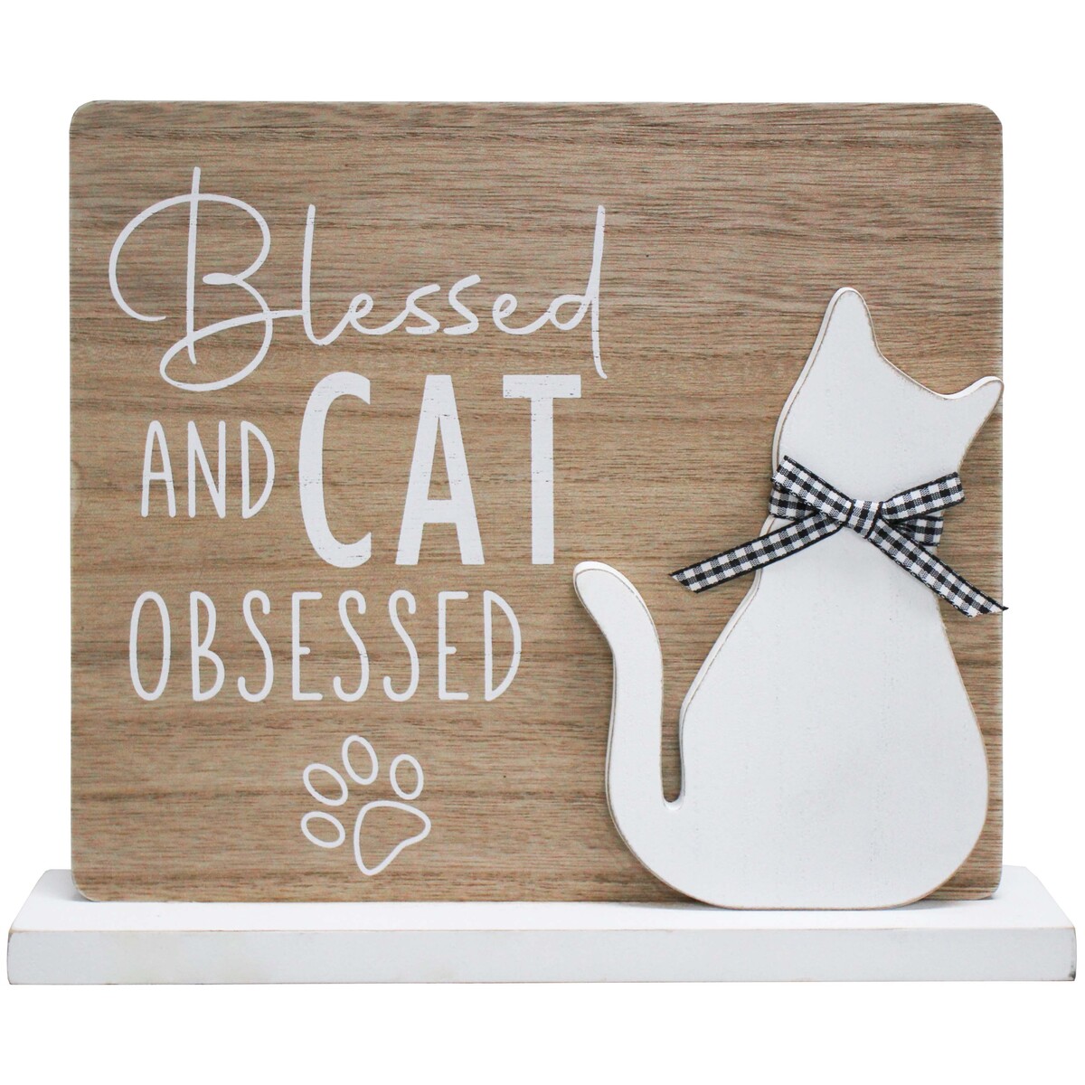 Let’s start with the design - the grey base is a lovely hue that lets the white cat-shaped cut out stand out on the right. The checked black and white bow is a cute addition that adds to the whimsy of this sign, especially against the ‘Blessed and Cat Obsessed’ text on the left. The paw print detail is another delightful little touch.