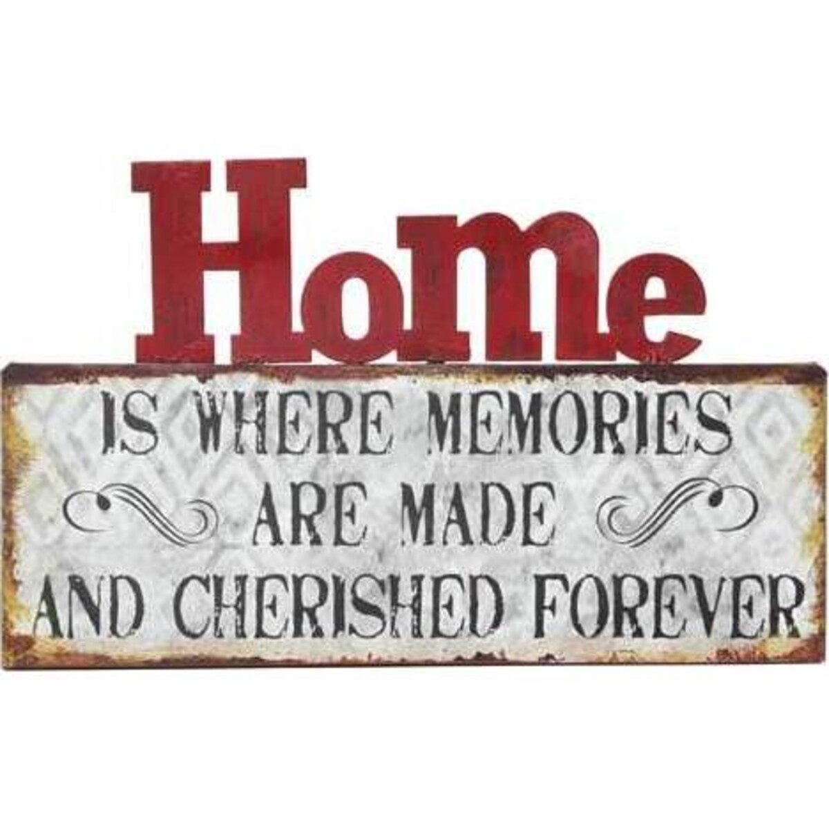 This lovely sign consists of a wood rectangle base that features a gray and white diamond background over which, in black lettering, it reads, "is where memories are made and cherished forever." On the top in cutout red lettering is the word "Home." The decorative accent is slightly worn to give it a charming weathered appearance, as if it were plucked directly from the shelves of an antique store. However, this sign comes to you dust free, in excellent condition, and best of all, without the high price tag.