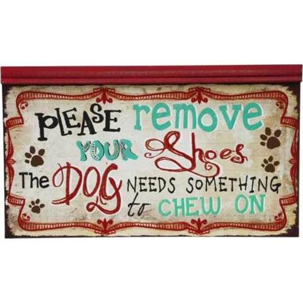 The footprints second the message on the frame, "Please remove your shoes. The dog needs something to chew on" This frame signifies that a person entering the house is supposed to leave his shoes outside the house before he enters. The message is strong but delivered in a subtle and informal manner, so as to not sound offending or rude. It has to be placed outside the house near the door and an appropriate height, so that a person entering the house can read it easily. The sign is easy to carry due to its light weight, yet sturdy enough not to fall off the wall. It is also reasonably priced making it affordable and accessible for all.