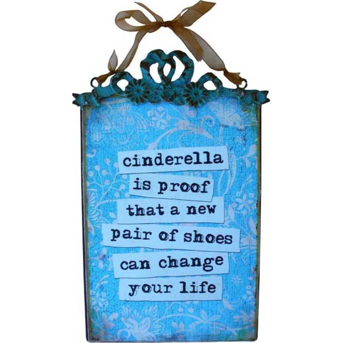 This sign Cinderella shoes reads 'Cinderella is proof that a new pair of shoes can change your life' is done in navy blue and written against background of sky blue. A beautiful hook lies at the top. It is designed to gently appeal to a young girl's heart, inspiring her to take up any challenge coming in her way with confidence and firm assurance of attaining success. A wide variety of media to this day embrace different plot elements, tropes and allusions from the storyline communicated by Cinderella. A girl with this signboard nearby can experience uplifting moments just with a single glance of it.