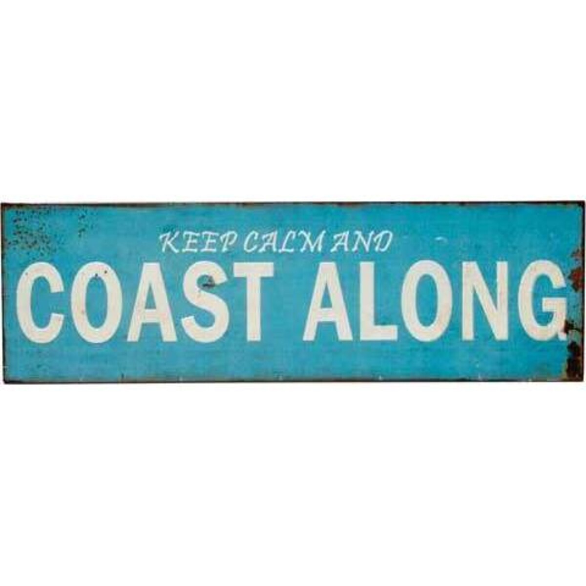 With a wide aspect of 49 x 15 cm, this tin sign is painted in a rustic, aged look that will appeal to people of a laidback nature. The white text is bold and bright against the dreamy blue, giving a soft and inviting ambience. "KEEP CALM AND COAST ALONG" is the message that will immediately put people at ease. Perfect for many areas of the home, or in outside areas on the patio or in the shed, this sign is easy to use and compact enough to slot into tight areas in need of a little life. The picture is framed by a dark rough edge to make for a striking design that draws the eye to the central message. A bright and cheery addition to any household, this sign is perfect as a gift or a fill-in item to add interest and a touch of laidback humour to a room.