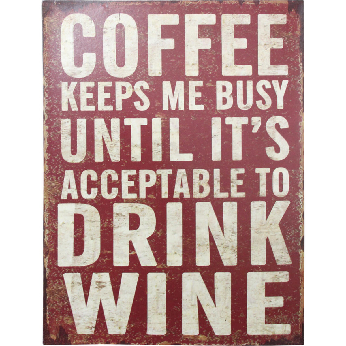 This sign Coffee Wine portrays the message that 'coffee keeps me busy until it's acceptable to drink wine,' in white against a brown prominent brown. It shows that the non-alcoholic beverage while sharing certain intrinsic qualities with wine does still excel over the alcoholic drink for its sweetness and aroma-infusing characteristics. Another critical quality is its universal form, being consumed in over 60 known distinct flavors. The seeds get roasted to various degrees, which depends upon the flavor targeted, prior to getting ground and brewed in order to create coffee. One may avoid wine long enough to replace it with coffee and not realize marked difference in beverage satisfaction.