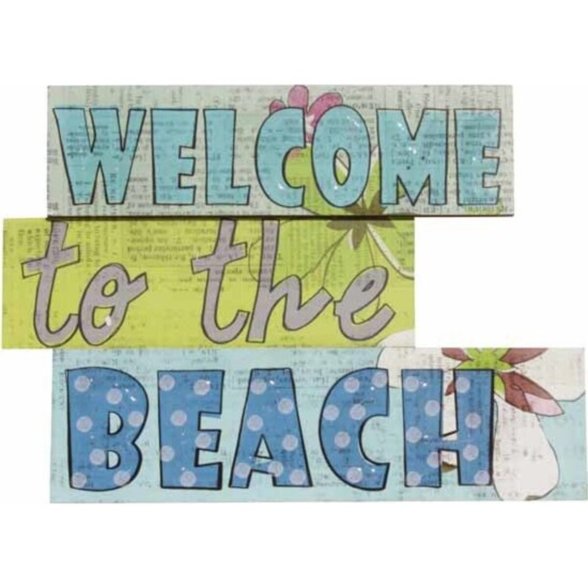 This eccentric and colourful beach themed home accessory gives home a more exciting and cool touch. It blends with other home accents especially those with the twist of aquatic and marine loving design. The vibrant and youthful features of the decorative sign are showcased all over. It has bright colours and background, wacky and diverse fonts and fun patterns and design. There are three layers in this ornament. The first layer shows off the text WELCOME in light blue shade. It has printed background with floral patterns on a white canvass. The second layer of the Sign- Colour Beach accessory has printed yellow background with the texts "TO THE" at the centre. The last layer highlights the BEACH text in dark blue with dotted patterns and light blue colour background.