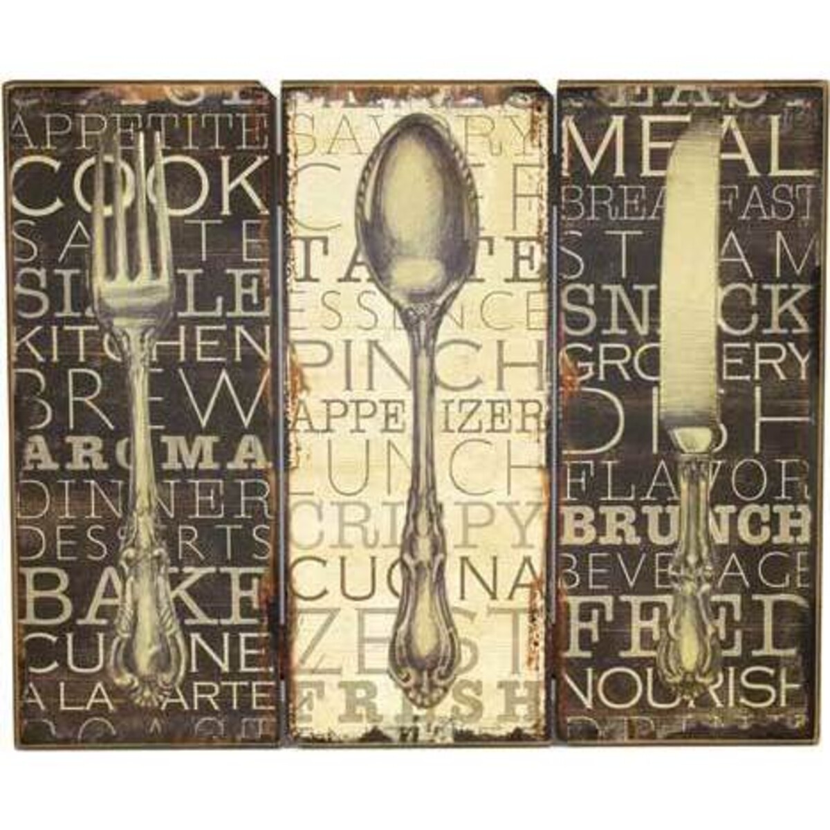 Introducing the Cutlery Cooks Sign from Lavida. It features the image of a spoon, knife and fork, each in their own respective sections and each over a word-covered background. It's a fabulous piece of art to put in your kitchen. While its lovely appearance is a draw, the best part is that its black and white colouring can complement a variety of themes and colour schemes in your room, so it'll blend well with your current design. It's sure to be one of your new favourite pieces of art.
