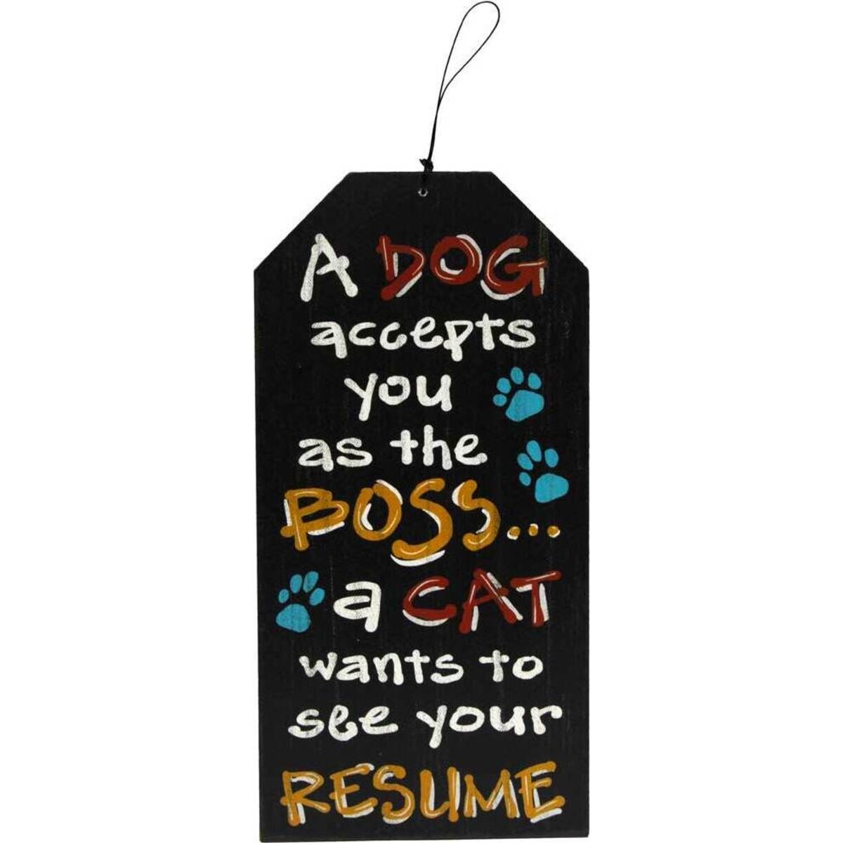 Many homes have dogs as well as cats co - habiting and when it comes to debates, the top of the list would be the eternal one that judges the two for their intelligence and abilities. Cat lovers believe that these feline beauties are not just beautiful but extremely choosy about their masters while a dog lover already knows that dogs give love unconditionally. That lays to rest the case but putting forth the idea in the most succinct way is this line scrawled across the blackish coloured board - a dog accepts you as the boss while the cat wants to see your resume - plain and simple. The message written in a chalk on board style looks very natural and just the kind of small decor addition to homes where the fun of having pets is experienced each day. Would make a lovely gift to any dog or cat lover .The sign boards made of MDF is charcoal black in colour with the writing in blue, white yellow and red, making its colours pop wonderfully .Hanging this 35 cm long board is easy as it comes with the mounting provision at the back.