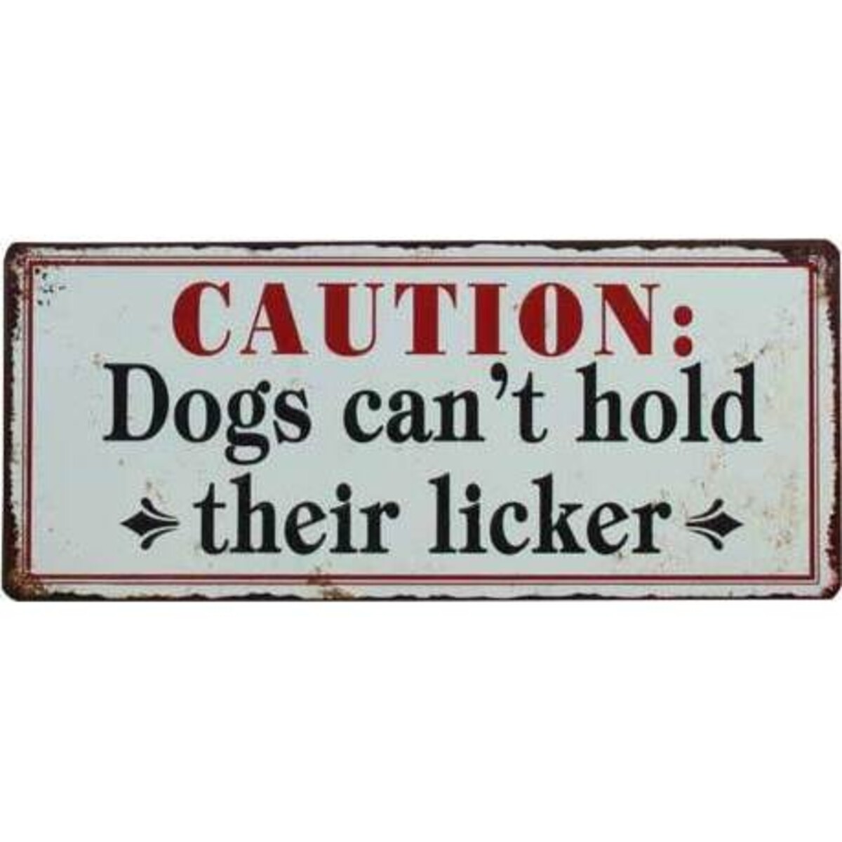 The off - white horizontal signs feature a red border as well as wording that reads, "Caution: Dogs can't hold their licker," in red and black print. The signs are worn around the edges to give them an aged appearance, as if they've been used and well - loved for many years. These signs are a perfect way to make you laugh at the end of the day, or warn any guest who comes to your home that there's a good chance they may be covered in puppy kisses by the time they leave.