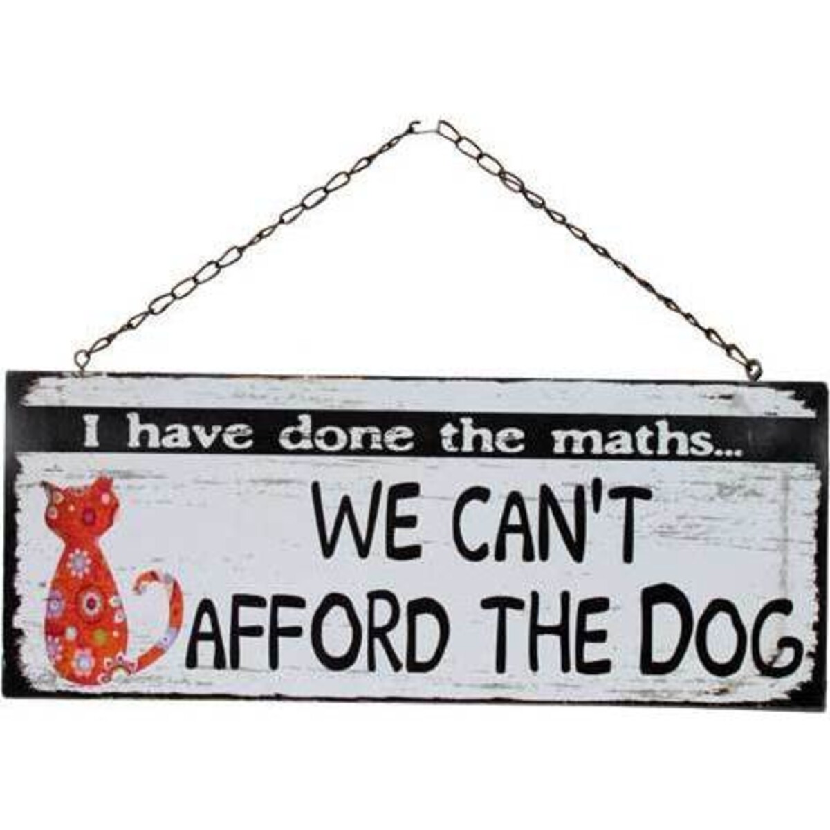 This white sign features a dark border, the image of an orange floral cat, and the words, "I have done the maths, we can't afford the dog." If only cats could speak, you know yours would be saying just that! A dark chain attached at the top allows for easy hanging. Whether you put this sign indoors or out, it's going to make a sweet addition to your home. You can also pass it on to your favourite cat fan in your life as a fun gift.