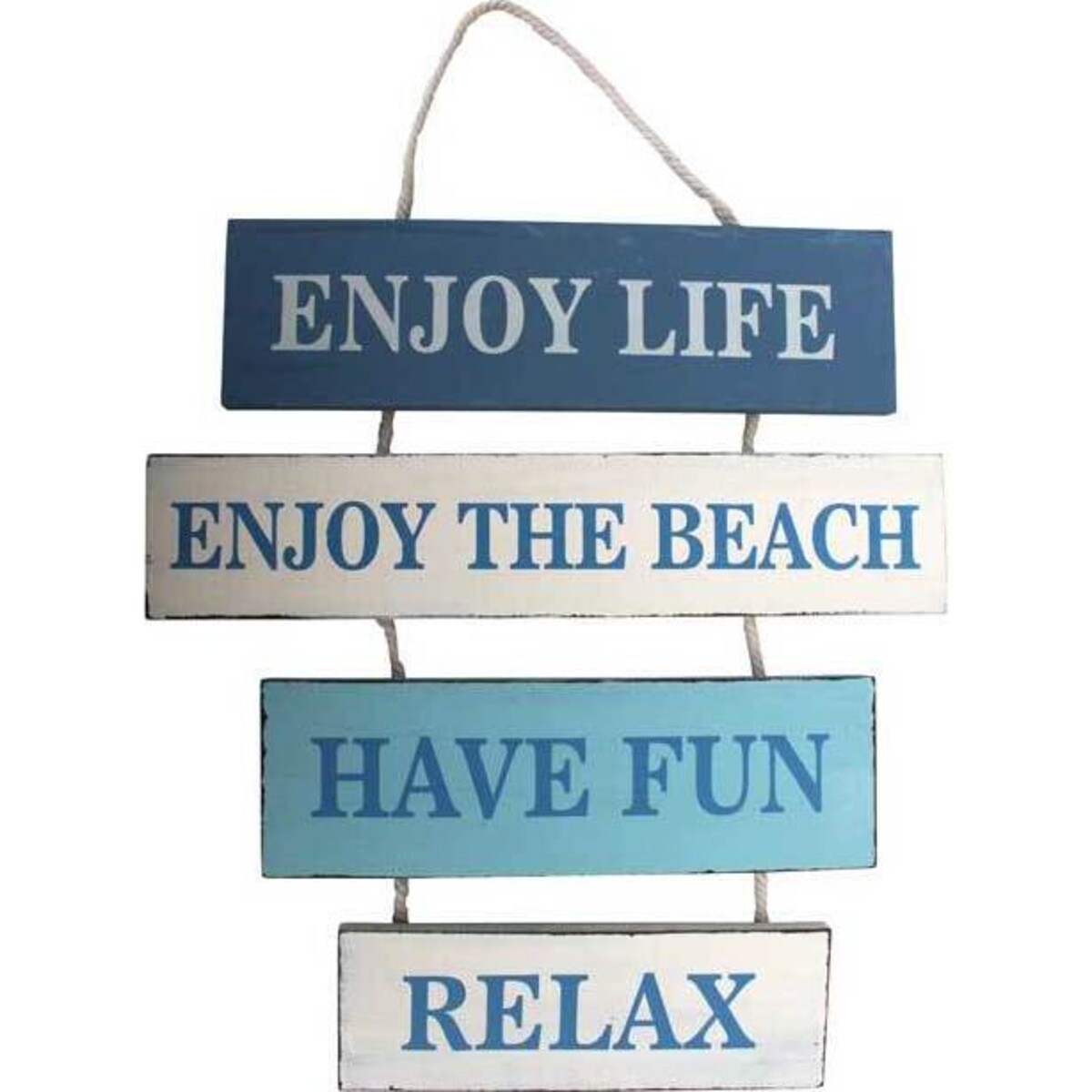 This sign features four horizontal blue and white wood pieces that read, "Enjoy life," "Enjoy the beach," "Have fun," and "Relax." Each section is connected to the other via a thin white rope that's looped at the top so you can easily hang it up wherever you desire. Whether you have a beach home or just aspire to have one someday, you'll love displaying this decorative accent where you can see it on a daily basis. Expect to get a lot of compliments on it with many asking how they can get one for their own.