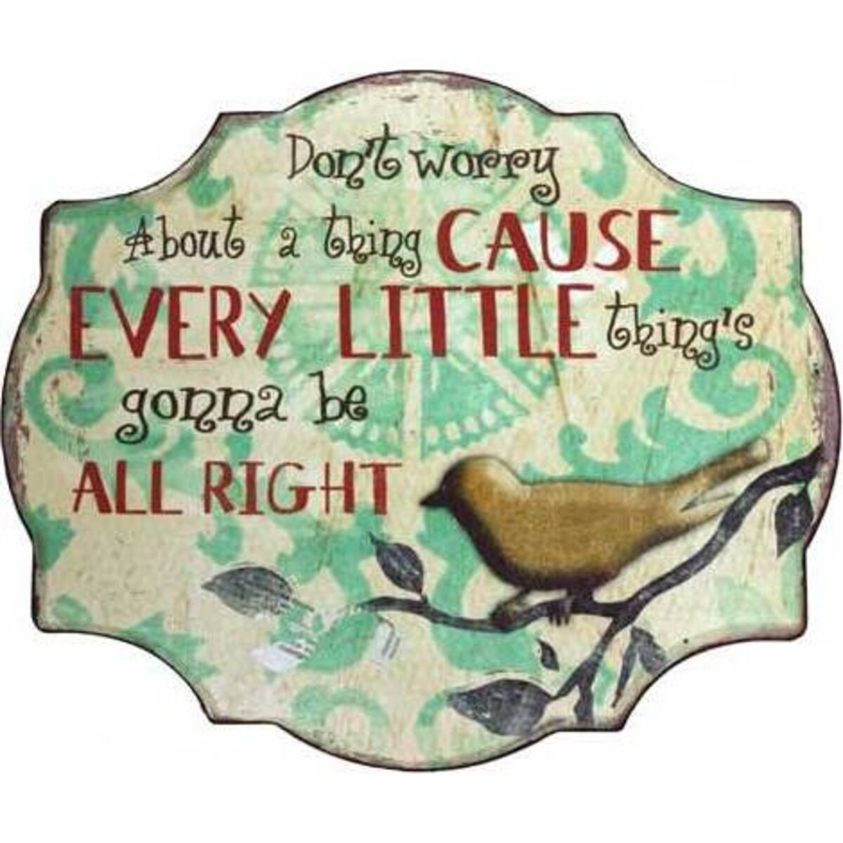 Homes, offices, all kinds of spaces always need something to remind one through those stressful times that bad times don't quite last forever and that passing clouds will pass somehow. This sign board about 33 cm in width and 28 cm in height is slightly oblong and has a beautifully defined shape and sends out this optimistic message that - 'Don't worry about anything as every little thing's gonna be alright'. The message is simple enough to convey its positivism. The scroll across it is in a font that is very pretty and legible-a warm country and home feel radiates right through and a feeling of comfort is captured well - in fact it instantly puts one at ease. The edges of this mural is distressed along the edges and the choice of colour is vintage in its feel - in fact the paint has rubbed off in some places which adds that special charm to the piece. The little dove and the green leaves give an element of freshness to the entire look. Indeed a lovely gift for the person for whom one cares.