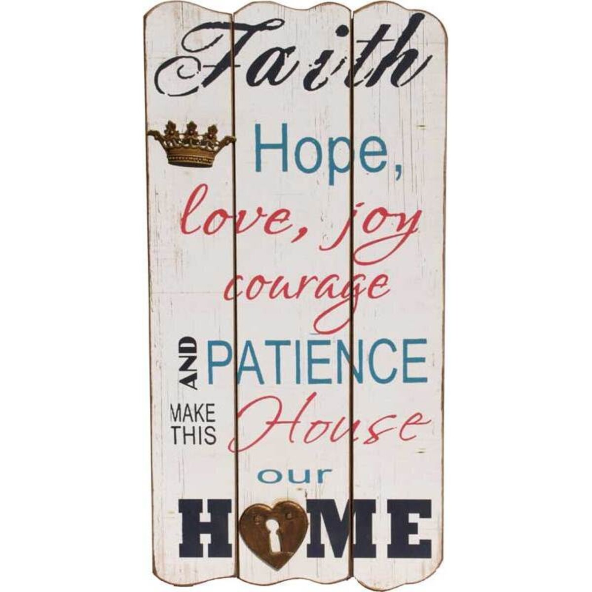 The center of the sign reads FAITH, HOPE, LOVE, JOY, COURAGE AND PATIENCE MAKE THIS HOUSE OUR HOME. The texts are in different font styles and palette yet with the bold and intangible effect contrasting the white neutral background.