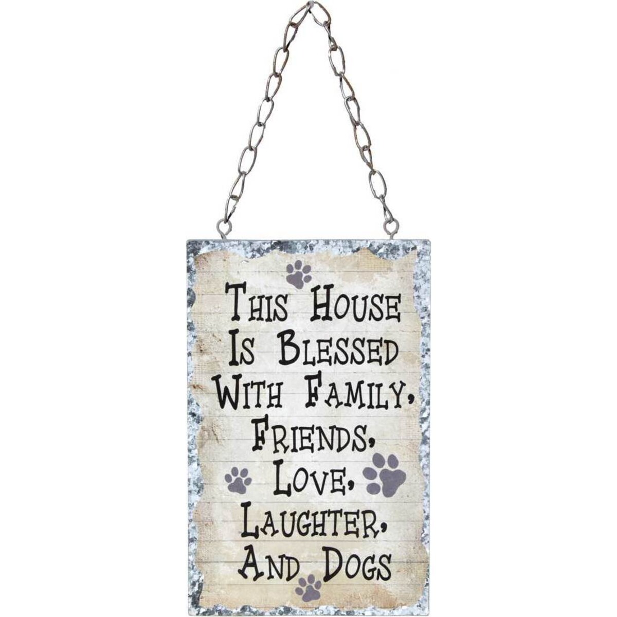 This beige sign features a gray border, and wording in black that reads, "This house is blessed with family, friends, love, laughter, and dogs." Four gray pawprints are the final touch to the décor. A silver chain at the top allows for easy hanging. Whether you put this on your porch, in your foyer, or elsewhere in your home, it's going to be your ? and your dog's! ? favourite new decorative accent. Keep it for yourself or give it to another dog fan, but it's sure to be a beautiful piece in any home.