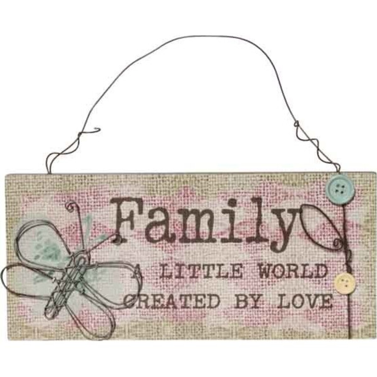 Inspiring family artworks such as the Sign Family Created piece is a priceless, flexible addition to homes, offices and other venues. This is no ordinary sign which is hanged anywhere desired. It is a moving masterpiece which provokes thoughts and deserves a second glance. It is also a remarkable gift item which is perfect for any occasions and special events. This rectangle shaped signage is created with an artistic twist. It has eccentric design and contemporary elements combined with the stirring texts. The frame is painted with pastel shades of pink and green. The texts FAMILY A LITTLE WORLD CREATED BY LOVE is boldly emphasized at the center of the frame. There are artistic tweaks embellishing this artwork such as the wire butterfly and buttons and yarns resembling an eccentric floral design.