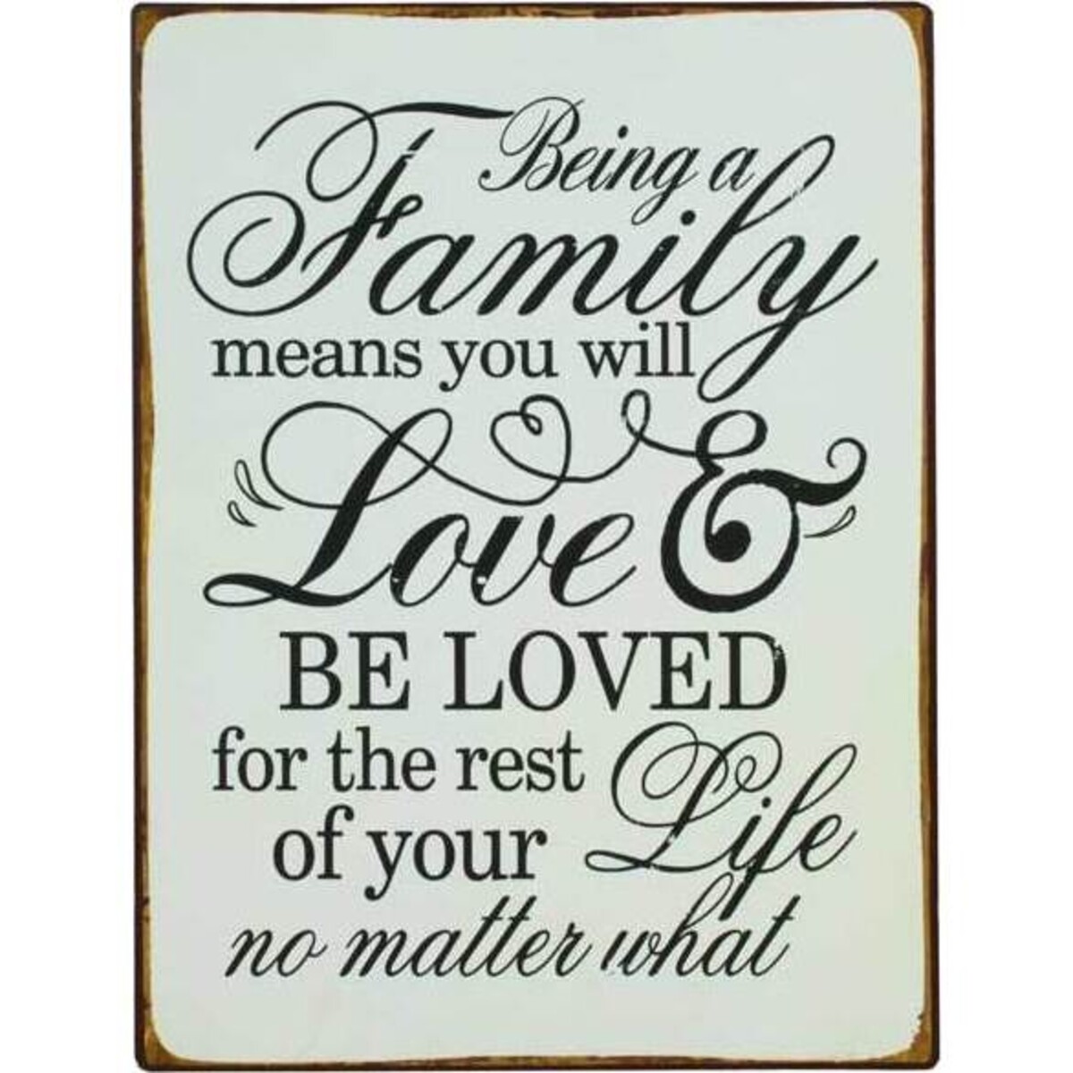 The importance of love and family bonds comes right through this beautifully designed retro look tin sign. The words are truly prolific - Being a family means that you will love and be loved all your life, no matter what’s - reassuring and filling one’s heart with gratitude - this tin sign is a lovely add on in family homes where children grow up in the loving care of large family. It’s a great sign also to put up in homes where teenagers are growing up, facing as they do the trials and tribulations of a typical and all those growing up pains. The tin sign has been created with vintage ideas in mind and has this rustic appeal as well as its own vintage charm coming through its vintage look lithographic font and the dull and peeling white painted background on which this ornate style of writing has been used. It is truly attractive, heart warming and adds that ‘feel - good’ element in the decor.