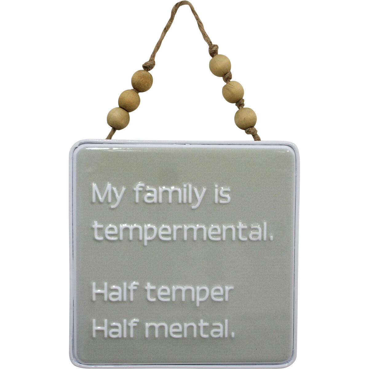 Discover the charming Sign Family Tempermental, a delightful addition to any home or office space. This whimsical plaque playfully acknowledges the spirited dynamics of family life with the endearing phrase, "My family is temperamental. Half temper, Half mental," embossed on its surface. Crafted from high-quality metal and adorned with tasteful beads on the hanging cord, this sign combines durability with a touch of rustic elegance. Measuring a cozy 15.8x1.5x15.8cm, it's the perfect size to make a statement without overpowering your space.