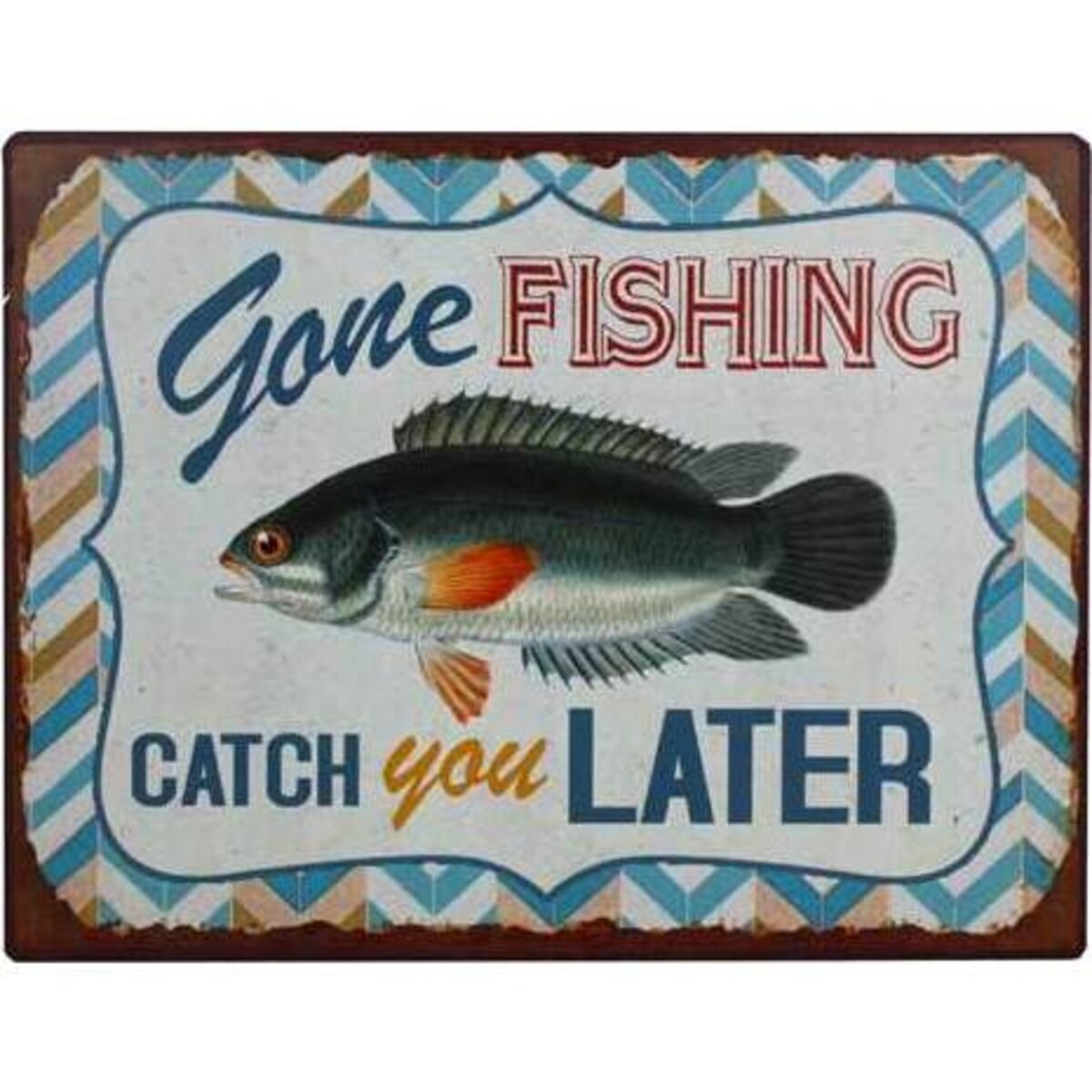 These metal signs feature an off - white background with a large fish at the centre and a tan, blue, and off - white chevron border. Writing around the fish reads, "Gone Fishing Catch You Later." The edges of the signs are worn around the edges to give them a weathered appearance, as if a fisherman has been using them for years. They're perfect pieces of décor to hang in your home or even on a covered front or back porch, but you can also put them out and let others know where you are.