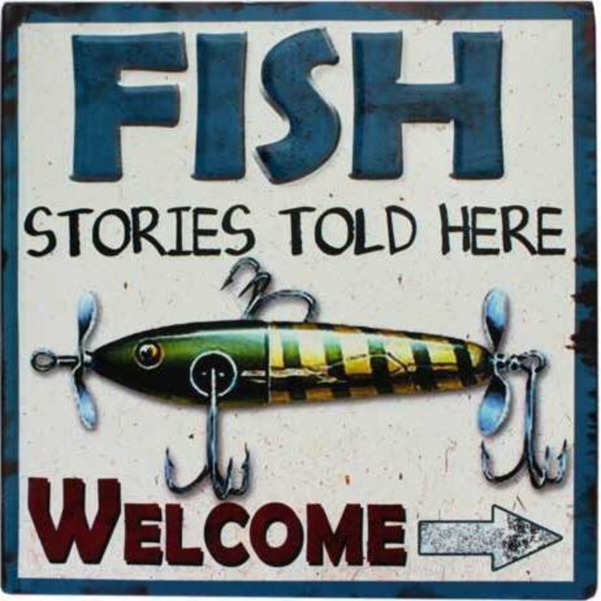 These square signs feature a white background with a blue border and a large fishing hook in the middle that's placed in between wording that reads "Fish Stores Told here Welcome." With all your fishing trips come some incredible fishing stories, and these signs let everyone know that they're welcome to share theirs as well. Place the signs in a home, in a garage, or even in a fish - inspired shop and get ready for the stories to come rolling in.