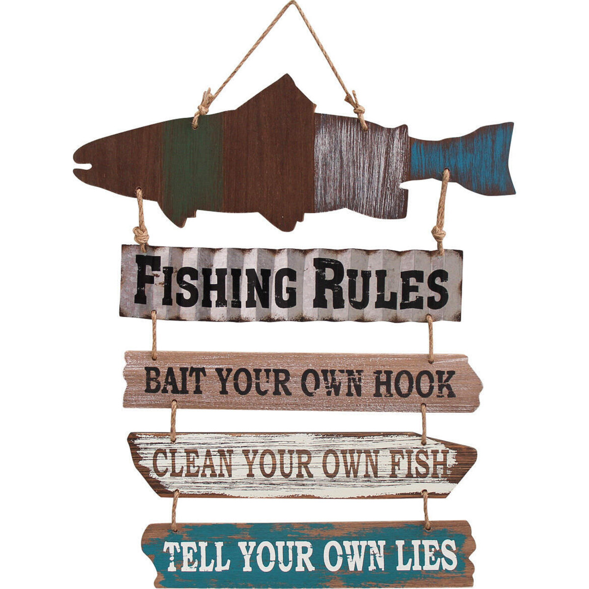 Make a statement about your love for fishing with this classic sign board crafted keeping in kind the typical traits of an angler. Telling lies and making up excuses being a foremost requirement, the signboard encompasses the funniest possible ideas in a beautiful pattern of a fish. The three little shabby boards hanging below carry the message with amazing accuracy. The wooden fish on top in multi-coloured wood has a drop-down menu of sorts to help your angling personality get a whole new feel and look. Knotted ropes slot through the drop-down facets of the hanging signboard give it an interesting shape. The several colours on the sign board liven up the look further. All of 55 m in height and 48 cm in width, it will make quite an animated impact on the space and bring with it the beauty of shabby choc design that is beachy and cheerful.