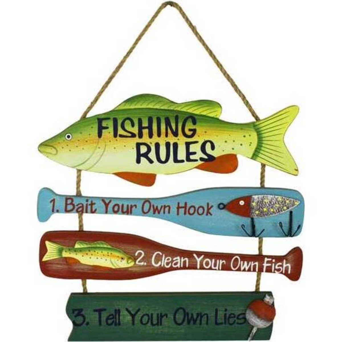 The words on the sign would instantly bring a smile to an angler's face - Bait your own hook - ‘Clean Your own Fish and Tell your Own Lies'. Angling is time consuming and keeps one away for hours in search of that elusive catch and anglers are known to come up with the most imaginative of lies and excuses. The double edged meaning of baiting the hook - would simply mean also making a plan, cleaning up the cat by getting away and also the need for some ingenuity while telling the next lie to legitimize one's habit. The sign board comes in wood with three distinct sections for each line - and the words fishing rules beautifully depicted on a green luminous looking fish, below which are three sections in different colours. Be it the colours, the rustic appeal of wood and rope or the wonderfully designed graphics –all of it combines to make a great decor piece for an angler.
