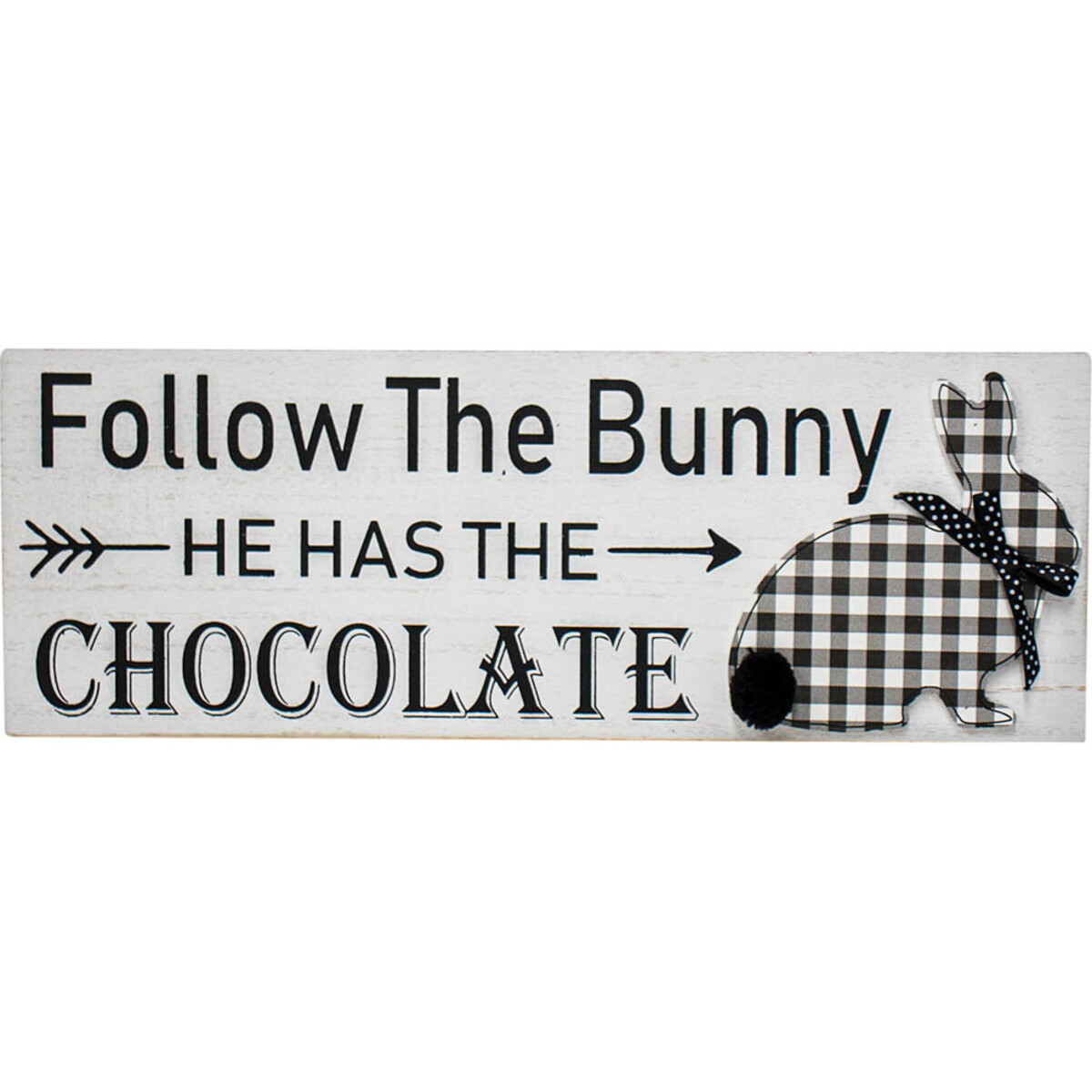 The Sign Follow Bunny is made of Medium-Density Fibreboard in a rectangular shape which measures 40 centimetres in length. On the sign board are pretty designs of a black and white checkered bunny which the kids are ordered to "Follow The Bunny", because "HE HAS THE CHOCOLATE" with a stylish directional arrow pointing to the image of the adorable bunny. The bunny even has a black bunny tie dotted in white. The words are written in black colour and in three different fonts over an ash coloured background. The adorable design therefore makes it a perfect choice for children's room décor, classes, and even parks.