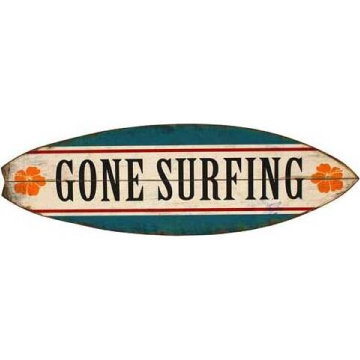 The horizontal sign features a surfboard shaped design with the words "Gone Surfing" printed in black over the white centre. A flower flanks either side with a red strip on the top and bottom and blue bordering the outer edges. Whether you actually surf every day or you just dream of doing so, these signs are the ideal way to conjure up memories of your time spent out on the waves. Keep them for yourself, but don't forget to also pass them along to those who love to surf as much as you do.