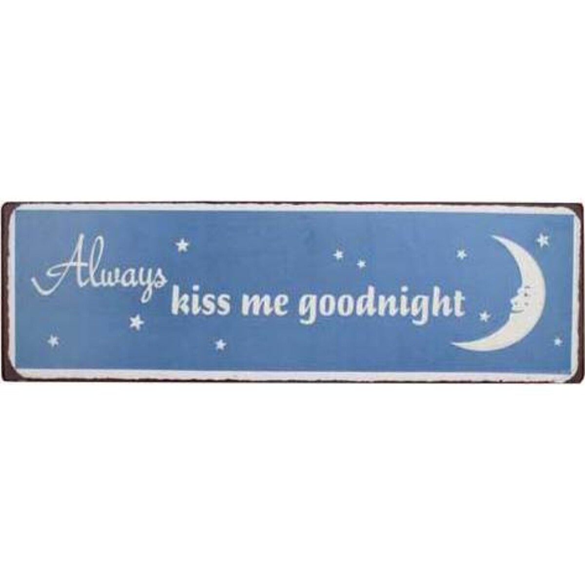 The horizontal blue and white sign features a blue background with a white border and white writing that reads, "Always Kiss Me Goodnight." White stars and a smiling white moon and the finishing touches. The edges of the signs are worn to give them a weathered appearance, as if they've been serving as a reminder for years to always kiss those you love before you go to bed. These signs are ideal for any children's or adult's bedroom, and are just as lovely to give as a gift to those you care about.