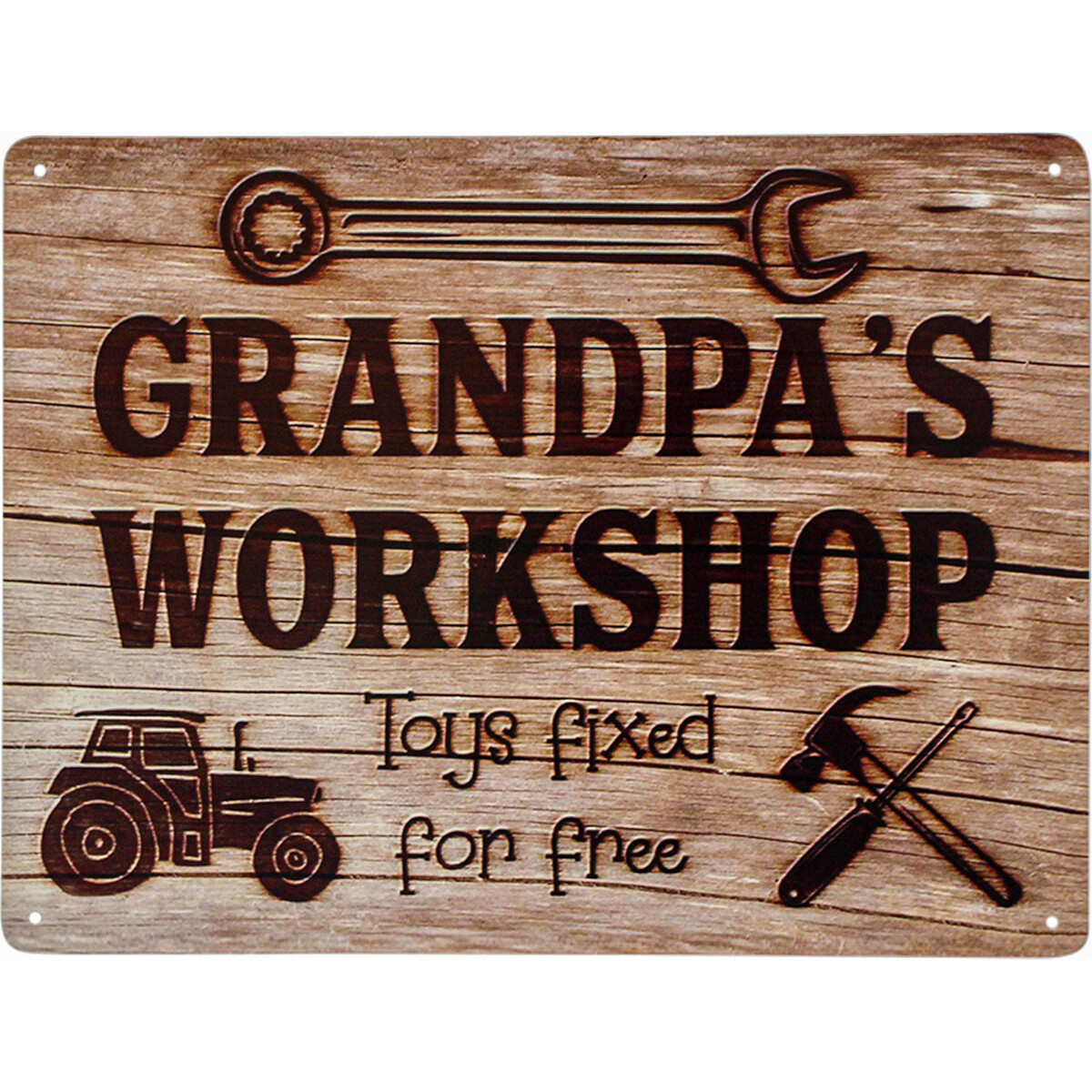 Grandpas are lovers of antique and vintage collections. Simply put, the aged are lovers of the Old World. Elderly people sometimes feel the need for a workspace or a man cave that allows for solitude. Likewise, little repair works can be carried out in this workspace to keep him busy. Sign Grandpa's Workshop is a charming vintage sign. The overall metal sign is aesthetically designed with a wooden outlook. To add texture to the flat surface, the metal plate is painted to imitate wood grains. This signpost is made of metal, a highly sustainable material. Metal also features improved strength and resist-ability.
