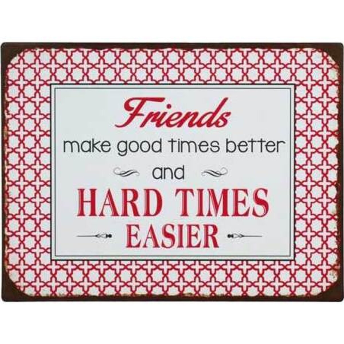For those who believe that friendship is what makes the world go round would love to won this tin sign that carries with it a rally heart warming message - Friends Make Good times better and Hard Times easier. A wonderful way to declare how important friendship means and a great gift for any friend one loves. This tin sign has lovely soft colour combination –mainly red and white with deep rust marks in places making it look all the more antiquely quaint. Tin signs in the past were a serious advertising men ass in the modern times its use has been to allow wearing one’s ideas and heart on one’s sleeve - this sign is no exception. Would be loved by all those who care for friendship and value it like the next breath of fresh air.