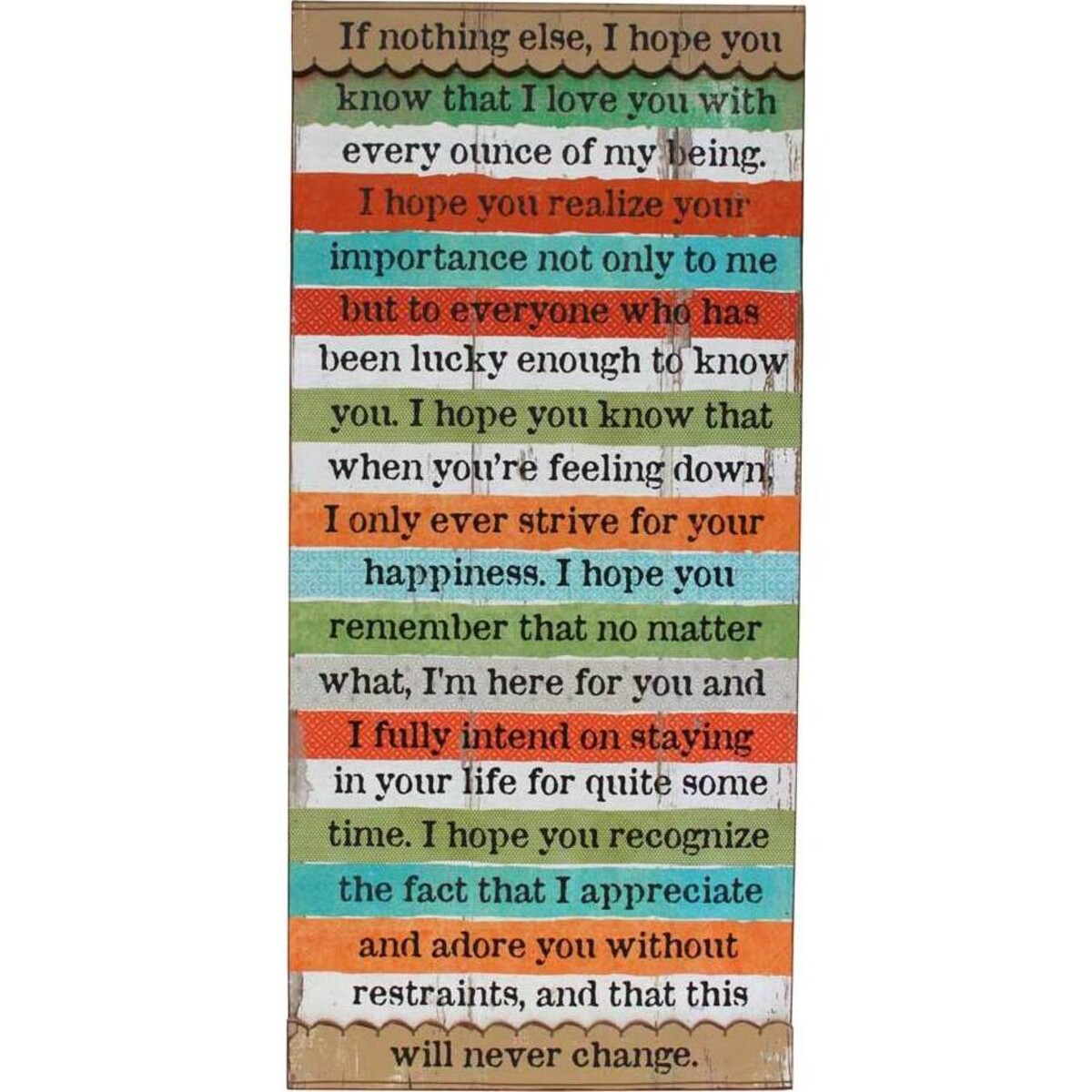 This multi-coloured sign is not only a beautiful work of art, but delivers a fabulous message. The sign reads, "If nothing else, I hope you know that I love you with every ounce of my being. I hope you realize your importance not only to me, but to everyone else who has been lucky enough to know you. I hope you know that when you're feeling down, I only ever strive for your happiness. I hope you remember that no matter what, I'm here for you and I fully intend on staying in your life for quite some time. I hope you recognize the fact that I appreciate and adore you without restraints, and that this will never change." It's a wonderful and heartwarming message the recipient will undoubtedly love reading on a daily basis.