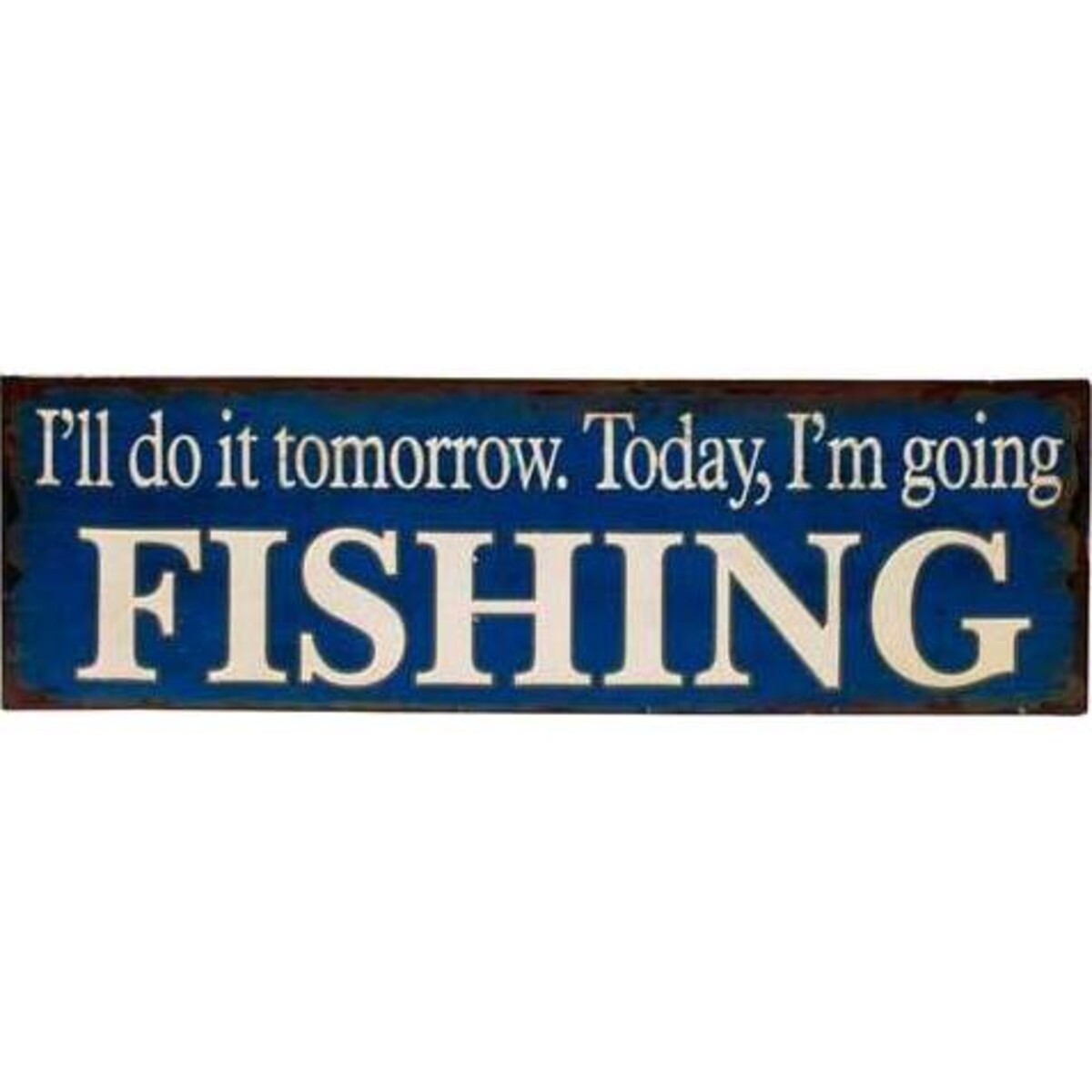 With bold white-yellow lettering against a deep blue, this sign makes its message clear, "I'll do it tomorrow. Today, I'm going FISHING". An ideal way to lighten the mood in any room of the house, or outside areas including the garage or garden shed, the sign is simply designed and effective. The dark surrounding border emphasises the deep blue and white lettering, making the message really stand out. This would make a great gift for the man of the house - someone who likes to take it easy and head off on fishing trips. With its wide shape, the sign can effectively be positioned in many tight areas - high up perhaps, above an entranceway. This versatile sign will raise a smile and be popular with all, especially lovers of fishing who like to skulk down to the lake for a break away.