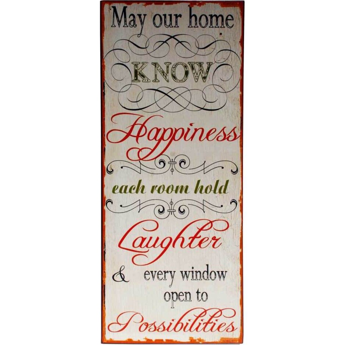 This sign at 30 x 76 cm has a tall aspect and is coloured in predominantly red against a light natural-look background. A rough rustic-style border surrounds the sign to frame the central messages. Elegant patterns and motifs surrounding the sayings, give life to the positive theme. The fonts and colours of the lettering are varied to capture and hold the interest, but are also legible and can be read quickly. "May our home KNOW Happiness, each room hold Laughter & every window open to Possibilities" is the sentiment that cries out from the sign, and cannot be ignored. Ideal for the hallway, this sign is a great way to greet family and guests, or even to make a tearful goodbye, that little bit easier. Striking and warmhearted, this design is sure to please lovers of home sweet home.