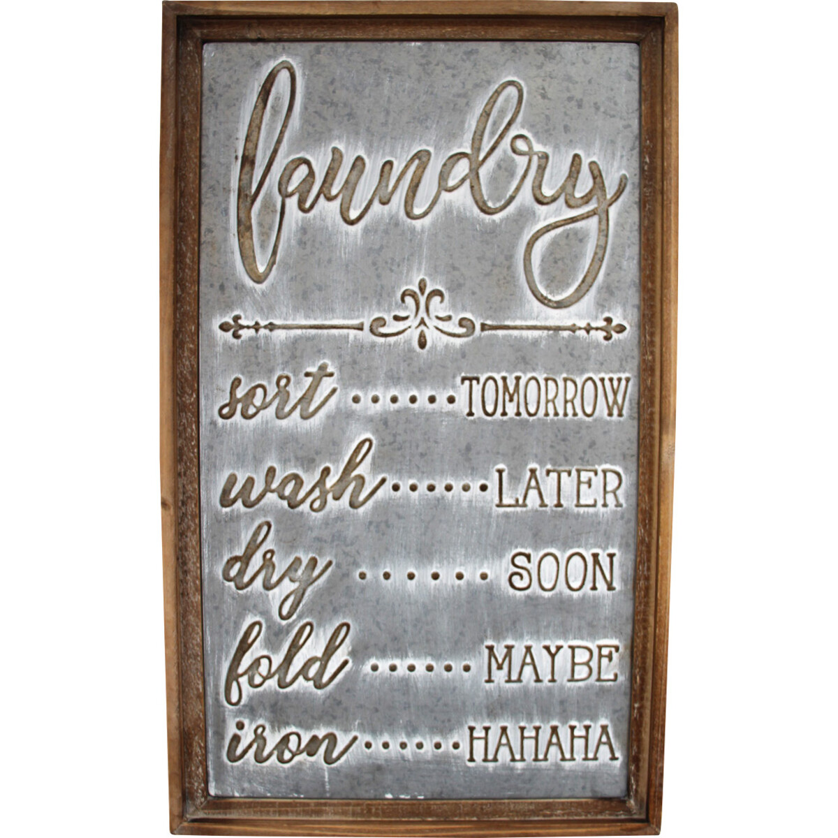 Our Sign Laundry Rules sign is a real treat for shoppers who love practical pieces with a bit of personality. Everyone's got that one job they don't really want to do - this sign gets it! The words carved into the timber and metal surface are clever and relatable, sparking a laugh in anyone who walks past. And the added charm of its weathered finish really makes this product shine.