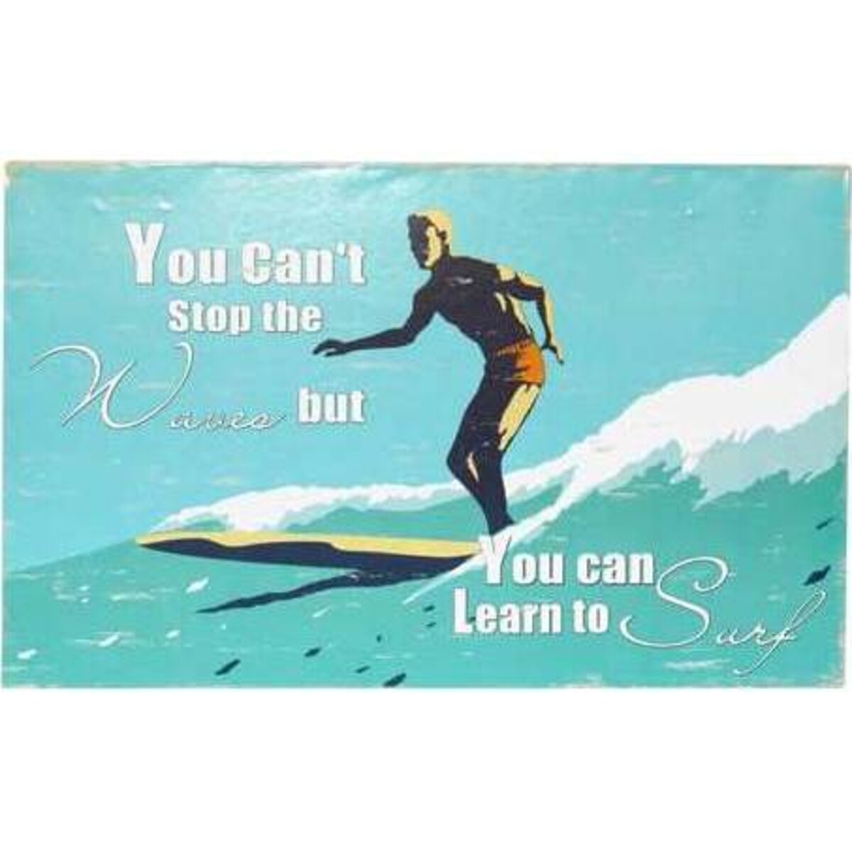 Ideal for a variety of uses, from a surfing school to a restaurant, a purchase for yourself or an appropriate gift for a friend who loves to surf, this sign evokes sentiments of the wind in your hair while you manoeuvre your surfboard through the waves, with the sun shining brightly and life only going upwards. Cleverly bringing together a positive idea about getting through hurdles while declaring a love for waves and surfing, this sign is both a popular and practical item. Measuring 60 x 39 cm, made of tin and painted in shades of white, blue and green, this sign is perfect for any wall space and can even be used as an advertisement. Whatever it may be purchased or used for, its eye-catching appeal will draw the attention it commands.