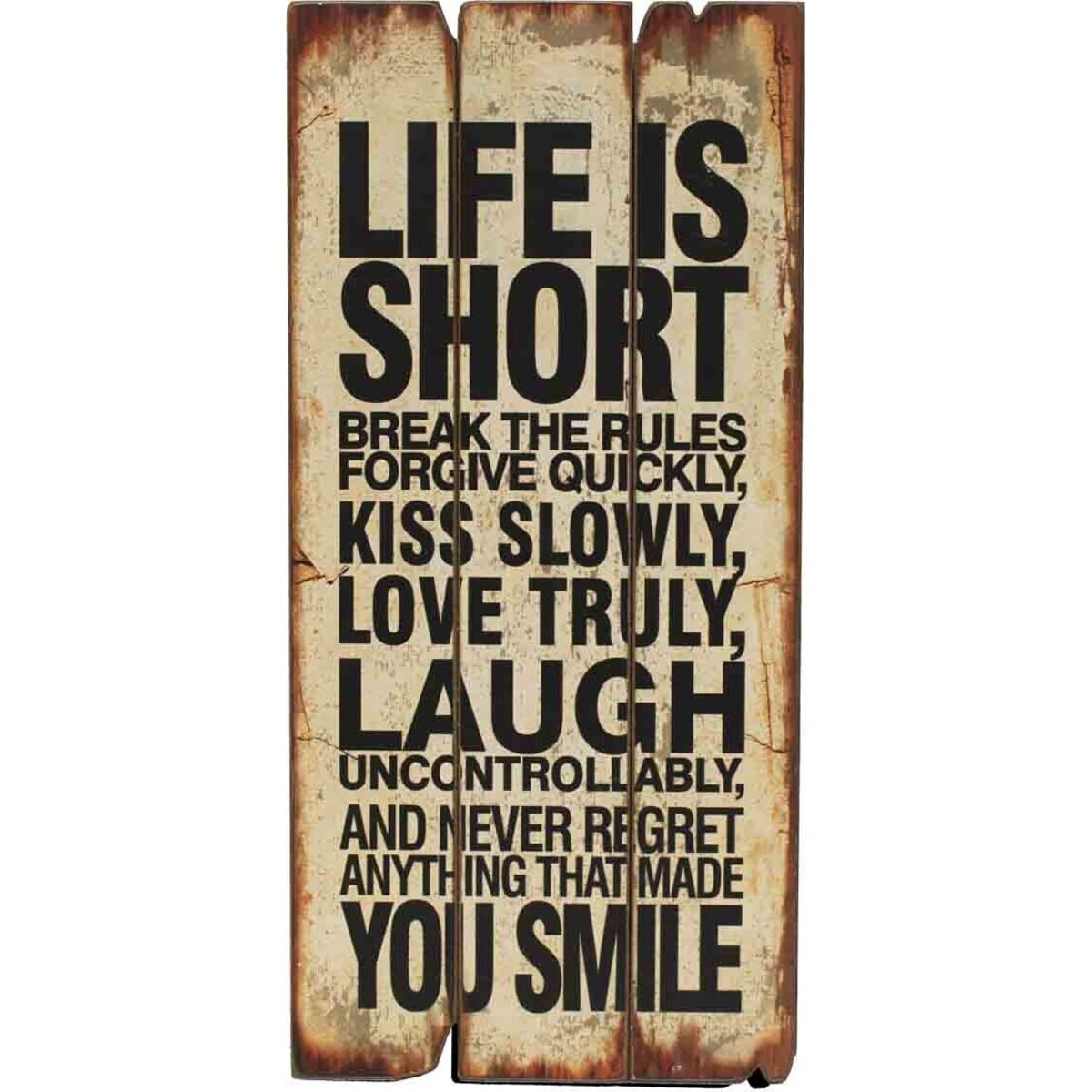 The eye catching Sign Life is Short piece is ideal for places with the rustic or laidback theme. It has the chipped, stained and worn out design especially shown at the edges of the frame. The beige background canvass is neutral and highlights the contrasting bold texts.