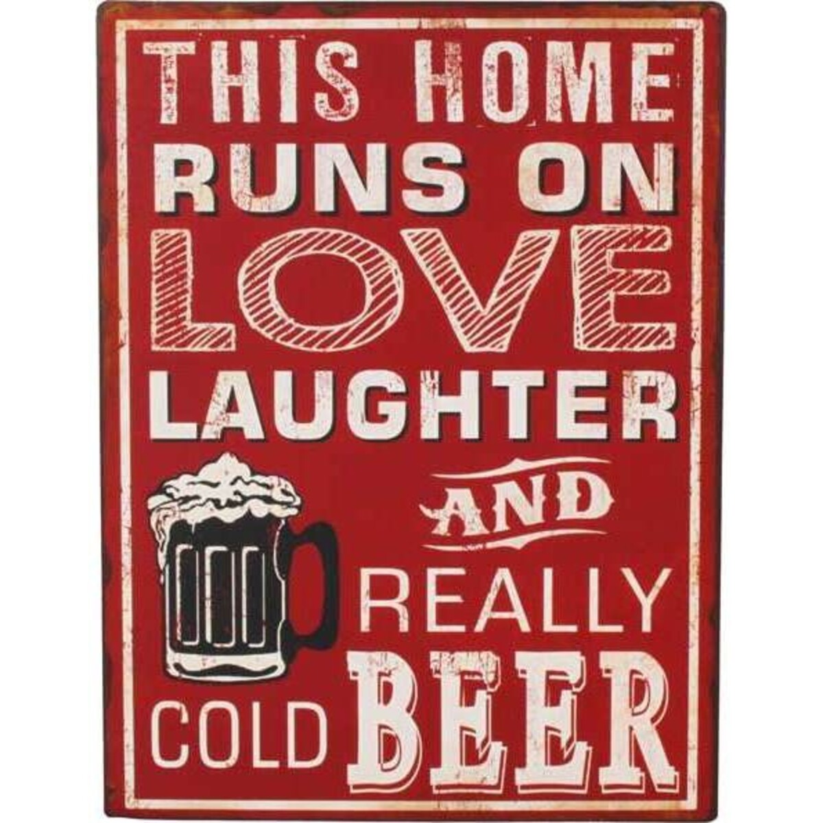 Slapstick humour if ever there was one - this tin sign begins with an intensely emotional message and ends rather candidly on what actually matters for 'real' happiness. A kind of sign that will be loved by all who love their beer as well as the fact that their home should carry an imprint of their real personality albeit with great style.