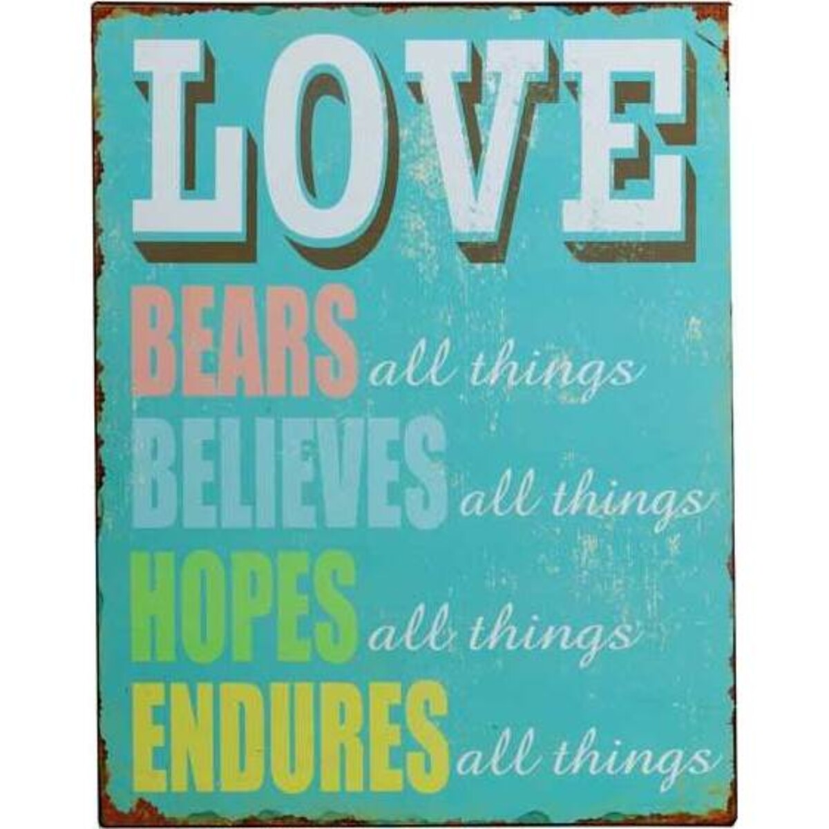 The Love Bears All Things, Believes All Things, Hopes All Things, Endures All Things sign is different from other signs about love because it looks like an antique sign but it is brand new. The beautiful lettering and spectacular colour palate will grab the attention of your customers and its versatility will make it easy to display in your store and in your customers home. Your customers will see this sign design sitting on your shelves and they will purchase them because of their design and the saying on it. And since it can be put in any room of your customers home, these sign will easily sell in your store and you will get a good deal on your purchase.