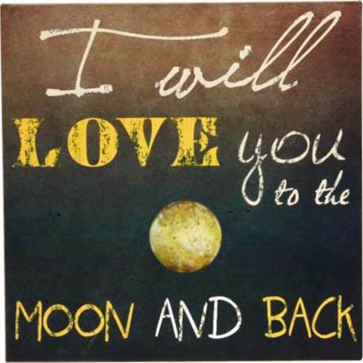 The background of the sign has an ombre brown to black colour scheme that features a yellow moon and the words, "I Love You to the Moon and Back" in varying yellow and white fonts. These signs are so lovely that they're ideal for any family member or friend, whether a child or adult, who means the world to you. They make wonderful gifts for any occasion, from Mother's Day to Christmas to graduation, and the colour scheme allows them to complement a variety of room styles.