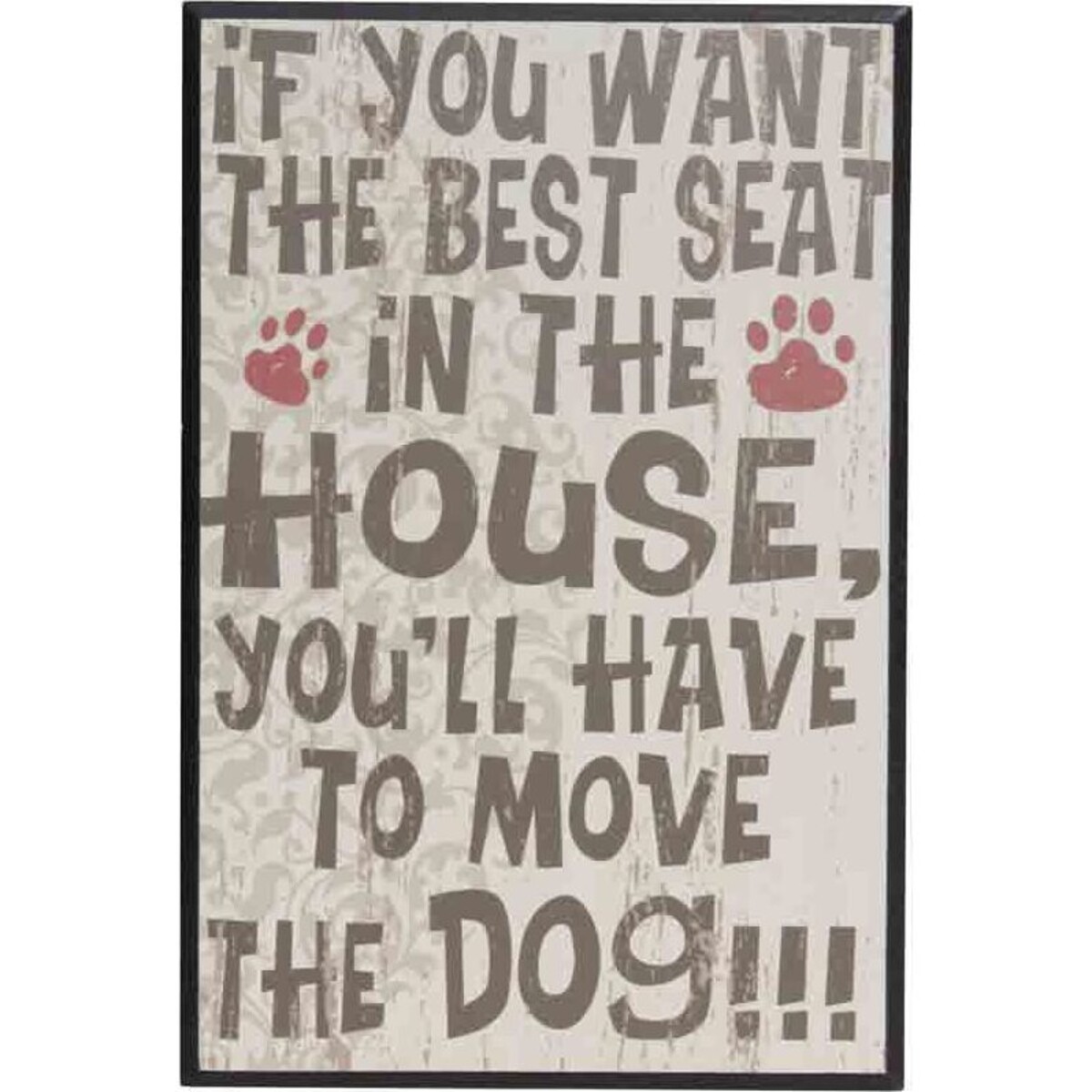 The center of the frame showcases the texts in a wacky font. The texts say IF YOU WANT THE BEST SEAT IN THE HOUSE, YOU'LL HAVE TO MOVE THE DOG!!! The decorative sign is also accentuated with two small dog paws in flashy red hue.